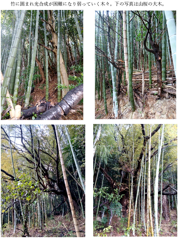 下の写真の桜の木、樹勢が弱く、枯れそう。周辺の地面は草が全く生えていない、真っ黒に枯れた草の茎が突っ立っている、表面はザラザラである。雨が降れば土が流されそうな状態。この山裾の一帯は地元の人が管理していると聞いています。これは草刈り作業を省き、除草剤で草の生えるのを押さえている。除草剤の弊害を考えない管理方法で、見ればすぐ判る。嫌な光景ではあるが、どんどんこういう情景が増えているのが現実である。 竹はこの状態でも出て來る。