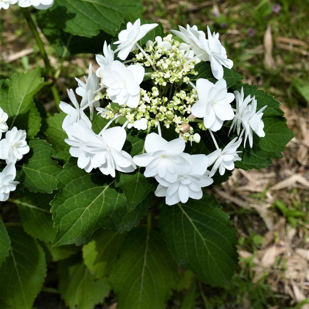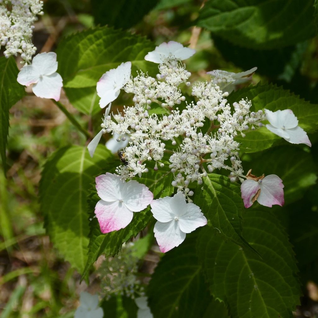 ヤマアジサイは小柄な花が多いのですが引き込まれるような魅力があります。葉の形は細長く先がとがっています。右の白いヤマアジサイは図鑑で見る限り「アマギアマチャ」に似ています。