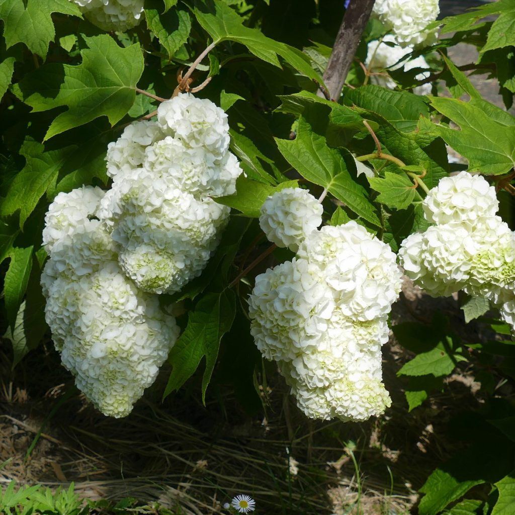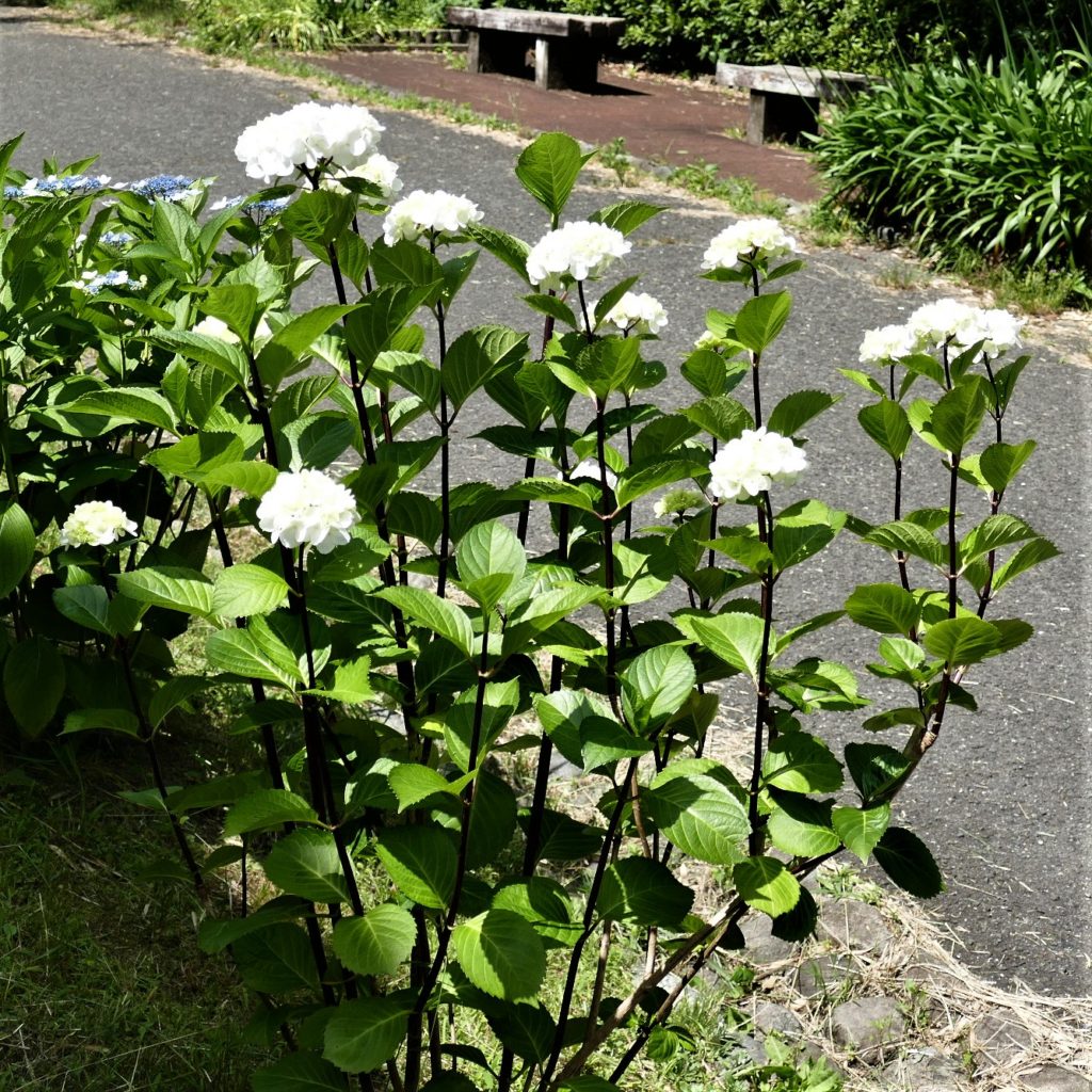 いわゆる「アジサイ」です。左が一重、真ん中が八重、右は樹形が綺麗な立ち姿です。茎が黒いので濃い色のの花が咲くと思いましたが、なんと白でした。
