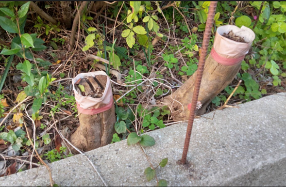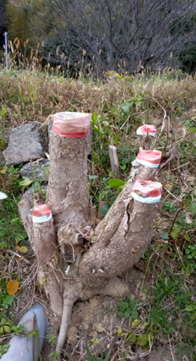 アカメガシワという木は畑の輪郭部、石垣のスキマ、空き家の敷地等どこにでも生えてその成長は早い。家の周辺にも他の木と共に自然に生えて茂っている箇所があっちこっちにある。枝、幹を切っても半年もしない内に又生えてくる。萌芽再生が活発である。管理する手が高齢化に伴って無くなってくるのと反対に木は年々生長し、巨木になって生い茂る。本数も自然増加する。特に、竹の繫殖力は旺盛で、昔、竹林が存在していた山も最近は山の頂上まで竹に覆われてしまったと感じることが多い。門真―和歌山(海南)を阪和自動車で往復する機会が多いが、貝塚、泉南辺りは特に竹の山が連なる。災害に弱い山に変わって行っている感じがして、気になる光景である。家の裏山周辺も年々竹の範囲が広がっています。同じ木を枝払いするのは馬鹿らしいので昨年は少し考えました。萌芽再生しないように、薬剤を使用しない方法でということで、下の写真の様にして、様子を見ました。除草剤で草も木も根こそぎ枯らす“ビッグモーター方式”は弊害があり嫌なので、どこの家庭でも日常普通に使う食塩を使いました。(スーパーで最も安い1kg78円)