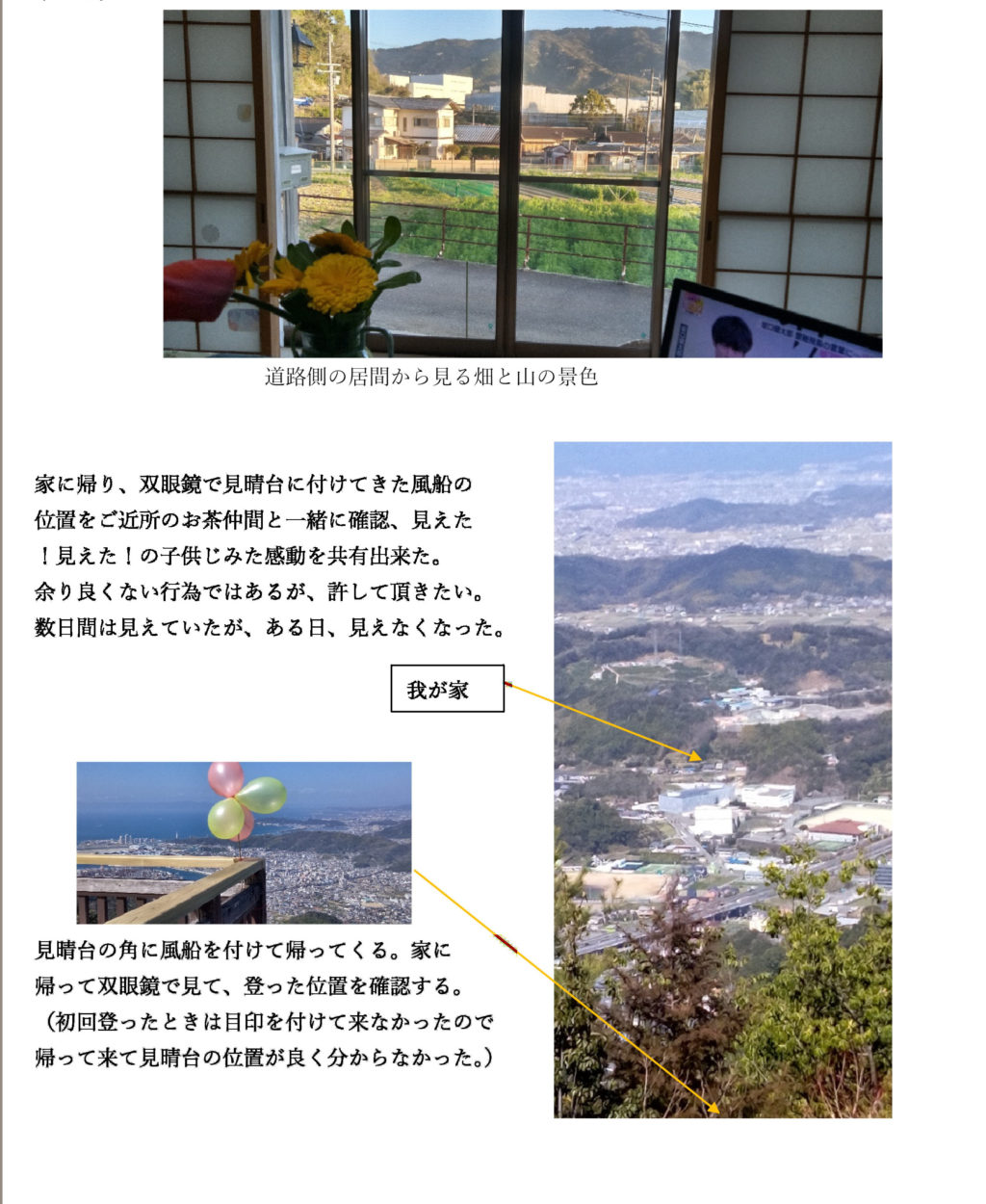 借りた借家の前に広がる畑の向こうに山並みが見える。その中央山頂部には海南市の見所の一つに挙げられている“雨の森神社”がある。海抜約400m。昨年、車で近くまで行って、残り30m程を登った。見晴台から海南市が一望、又、肉眼で家の位置を確認出来た。双眼鏡でははっきりと判る。今回は、家内と二人で🍙おにぎりを持って家から歩いて登ることにした。地元の歴史、情報に詳しい方に登り口、登山道を解り易い地図を添えて教えて頂いた。うねうねと山の谷間の舗装道を登ること約2時間、迷うことなく誰一人出会うことなく頂上に到着、眼下に広がる海南市の全景を見ながら昼食。帰りに見晴台の角に風船を付けて、元来た道へ。ようやく一組の同年輩の御夫婦に会い15分程お話をして、同じ道を下った。