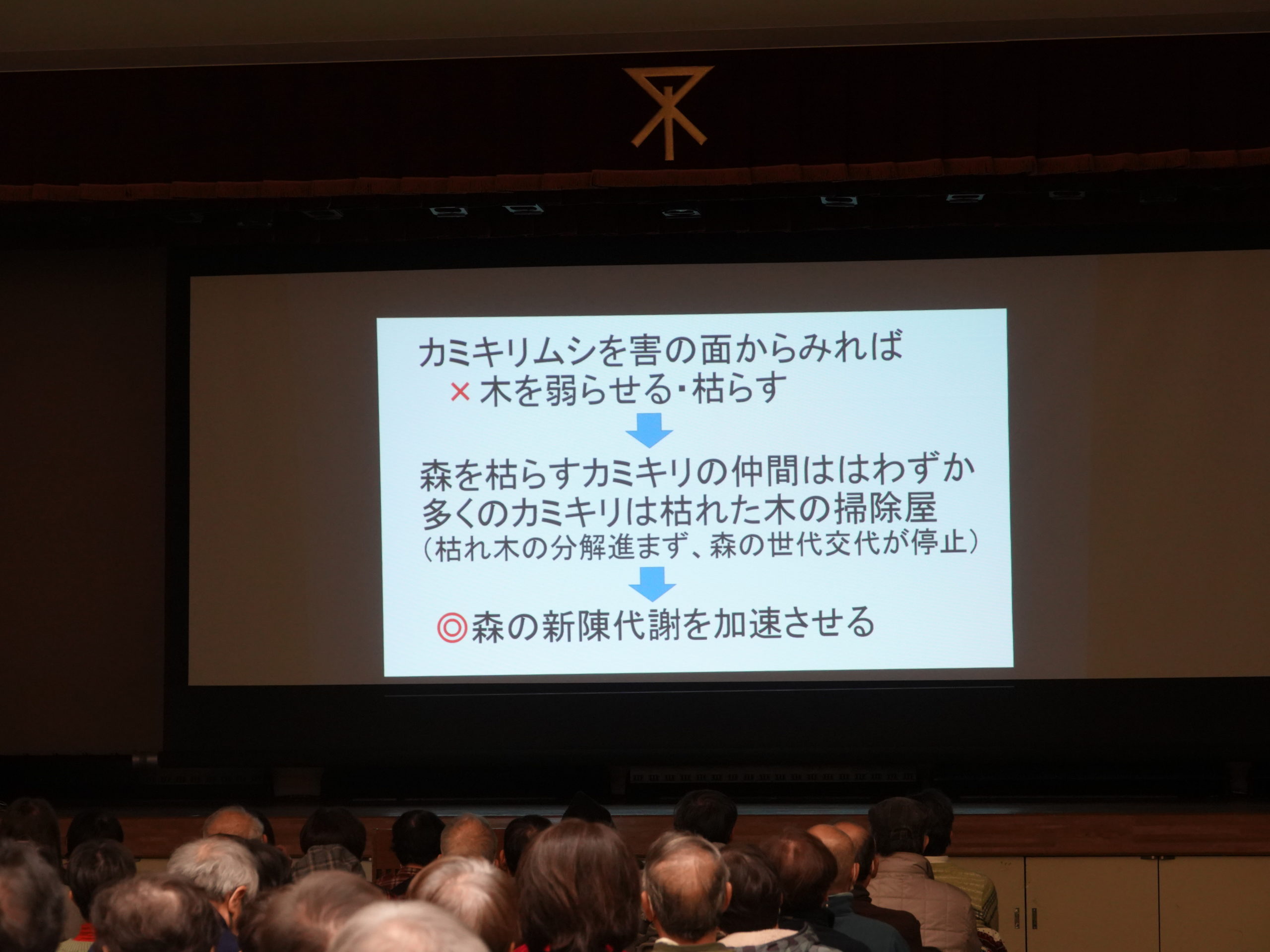 昆虫科 垣田さんの発表です。昆虫は「害虫」と「益虫」に2つに分けて考えがちだが、それは人間の都合による浅い考えではないか、という趣旨だったと思います。(違っていたらごめんなさい)野鳥でもスズメは「害鳥」と駆除される時期がありましたが、子育ての時期には稲につく虫を大量に捕獲します。