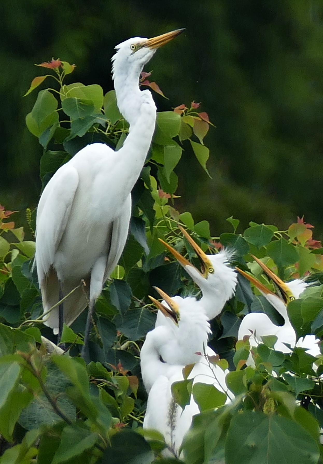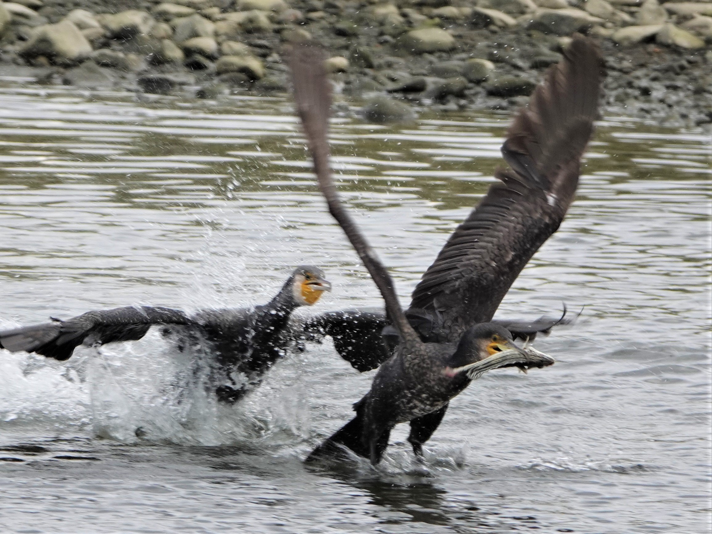 文化祭で掲示していただいた松田の写真です。「ご飯頂戴」は茨木市のサニータウン近くの公園です。小さな池の小さな島にダイサギやらゴイサギがてんこ盛りでした。雛たちは親に齧り付いたり餌を貰うのに必死でした。「頂きま~す」は泉南市の男里川です。ドジなカワウがうっかり獲物を落としたところを、隣のカワウに持っていかれました。