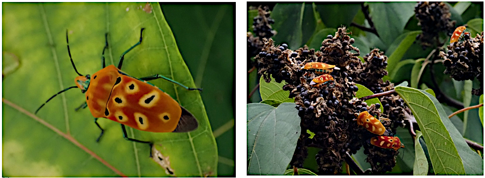 アカギカメムシは、5年程前に池田の細河で見ました。この時もアカメガシワの木を叩き、偶然網に入った1匹だけで、それ以降は全く見ることができませんでした。ところが摩耶山頂のアカメガシワに「いるわ、いるわ!」 葉っぱに実にと、見渡す限り鈴なりの状態でした。