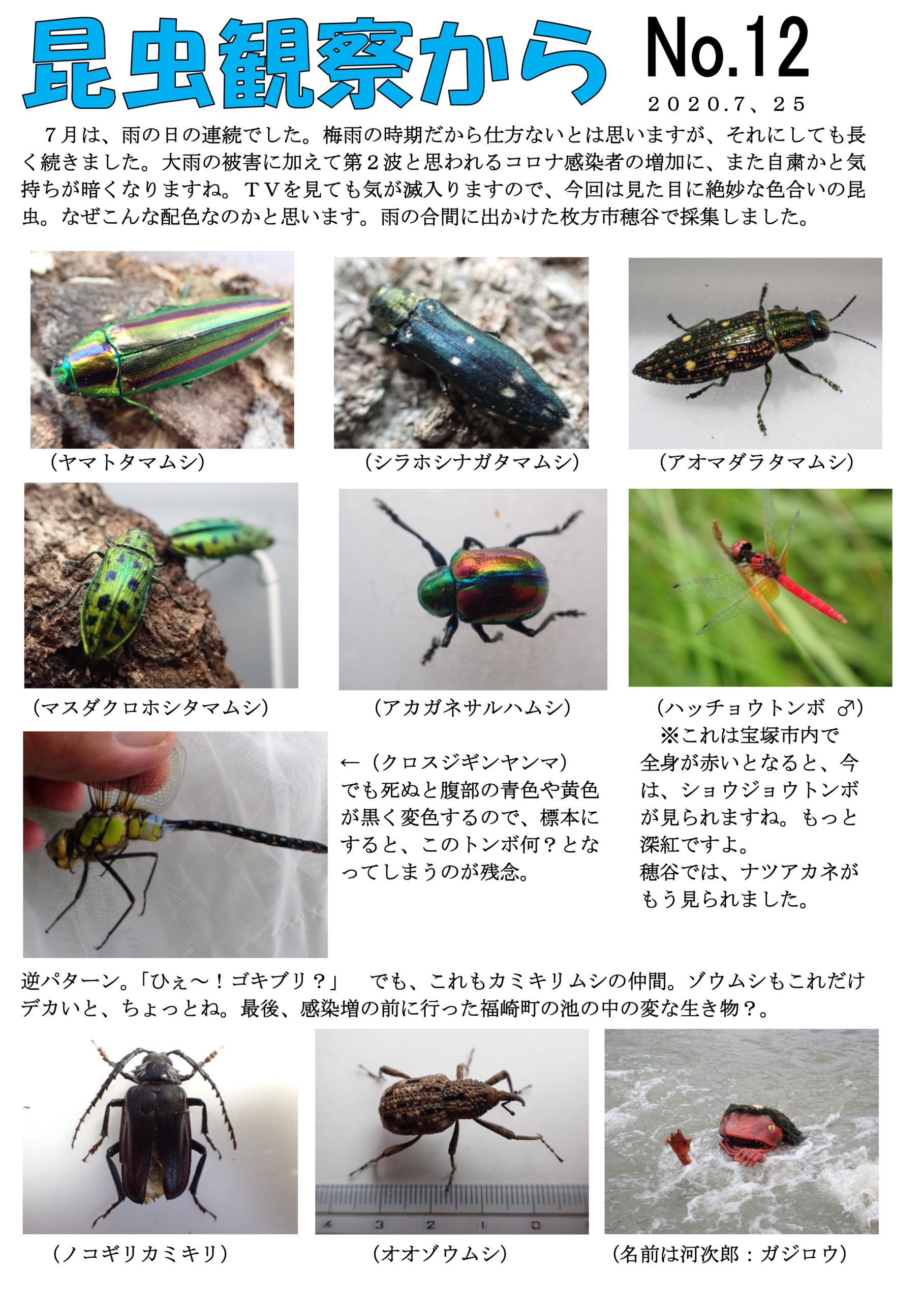 2020年7月25日 / 最終更新日時 : 2020年7月25日 musikansatu24-2 昆虫 昆虫定期便 No.12 降り続く雨で外に出る機会が少ない上に、新型コロナは感染者数の大幅増。また自粛の日々に戻るのかな。中学校の同期会の幹事もしていますが、今は会食するだけでも感染の危険があるとのことでどうしようかと・・・。 Copy