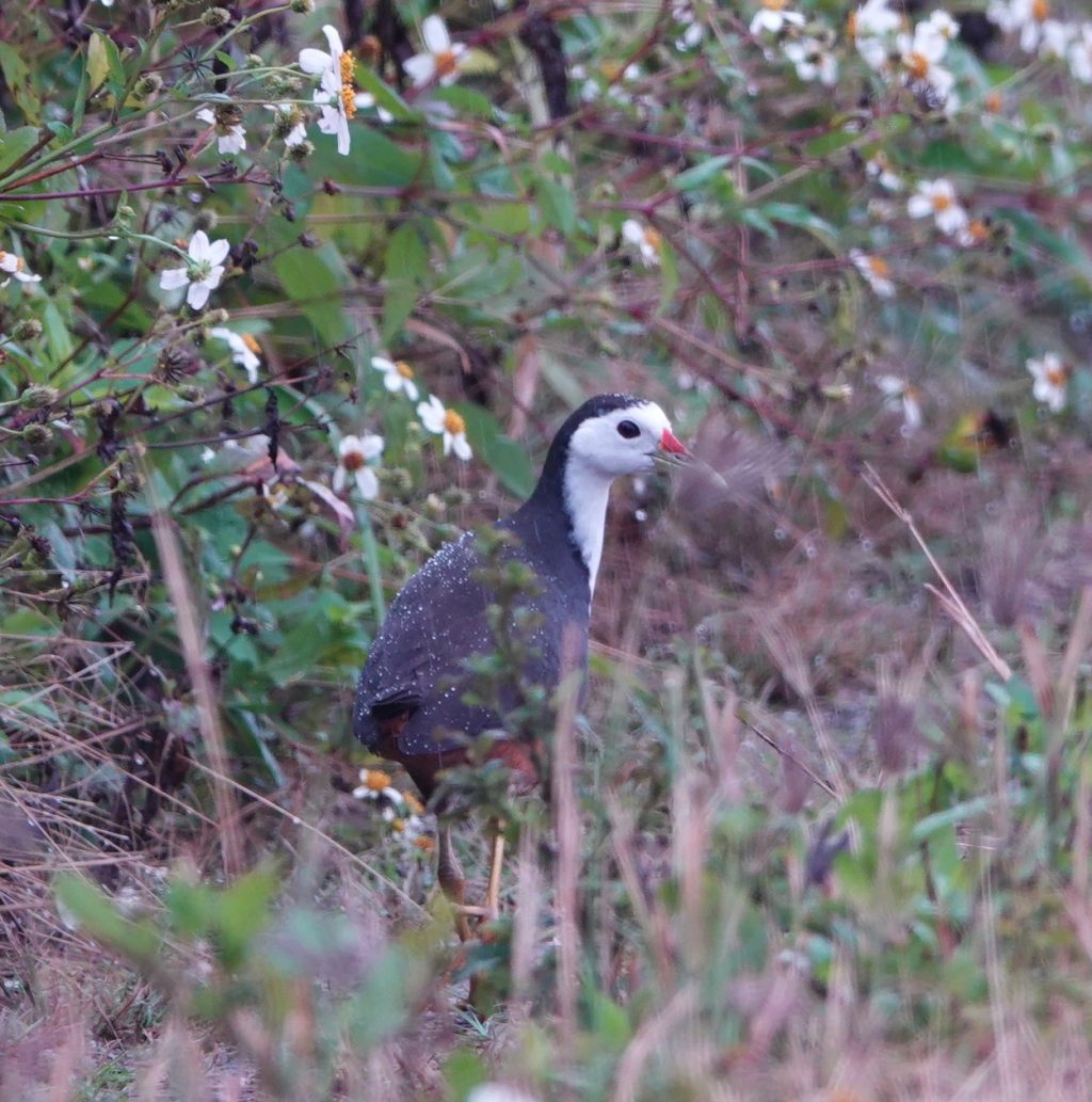 対称的にシロハラクイナは見つかるとすぐに隠れてしまいます。何度も見つけましたが、なかなか撮影するチャンスはありません。遠くから観察しました。雨が降ってきて背中に銀色の粒がきれいです。