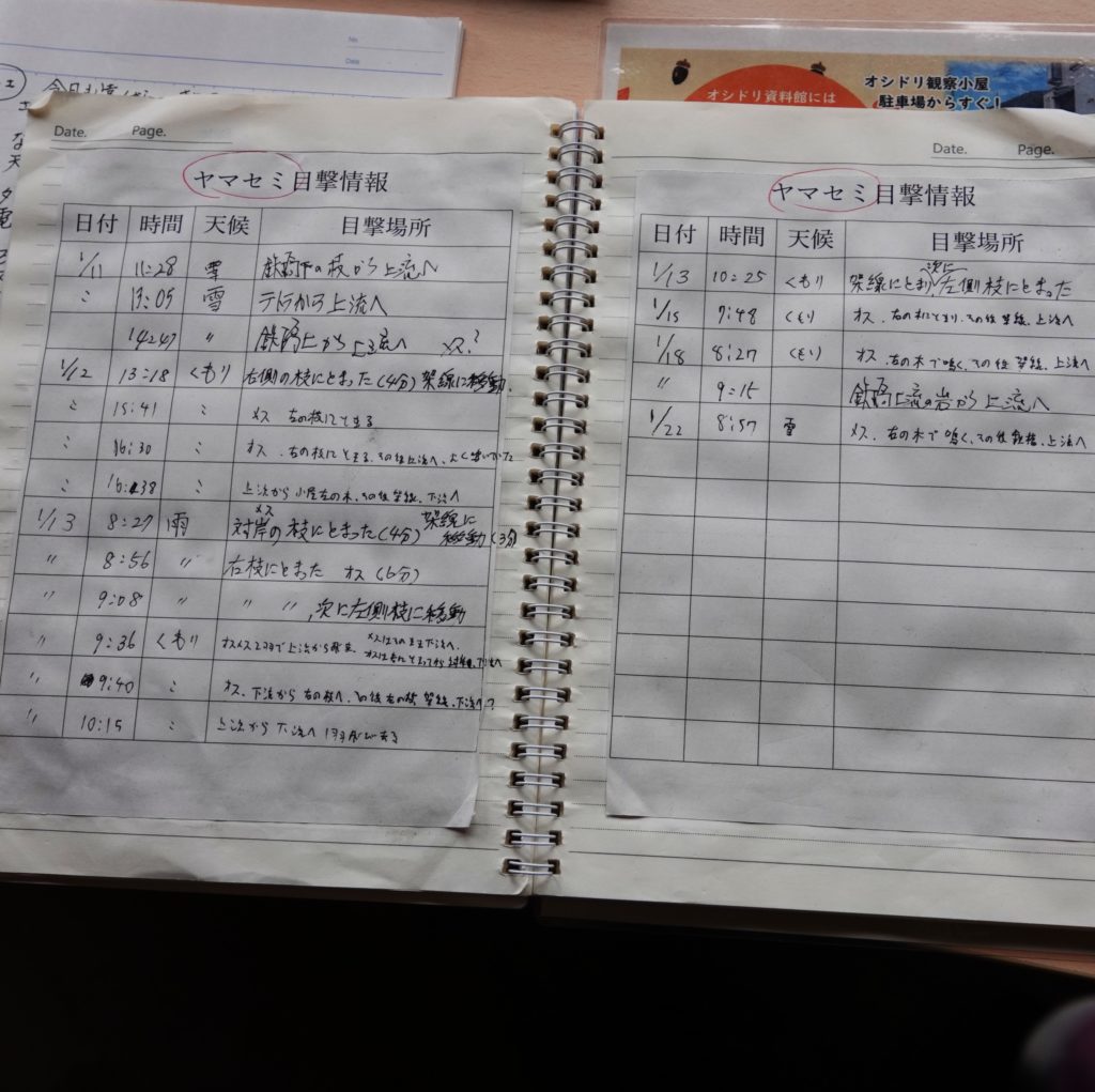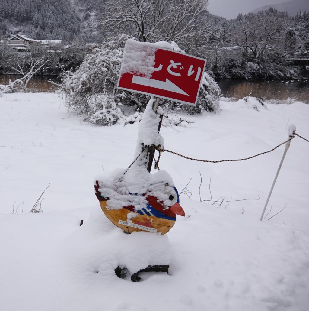 根雨の町は「オシドリ」で町おこしされています。町のあちこちにオシドリの絵があります。オシドリももちろんですが、今回の目当ては「ヤマセミ」でした。記録もきっちりとされていましたが、残念ながら私たちが訪れた日はヤマセミの訪問はありませんでした。大阪府の近辺ではほぼヤマセミは見られなくなってきています。