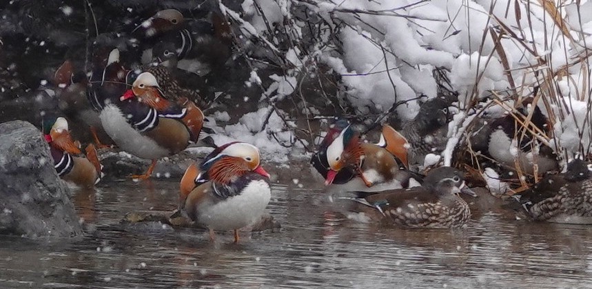 根雨オシドリ小屋のオシドリたち。よく見るとオスと同じくらいメスもいます。昨年は800羽位で今年は500羽位の渡りだそうです。