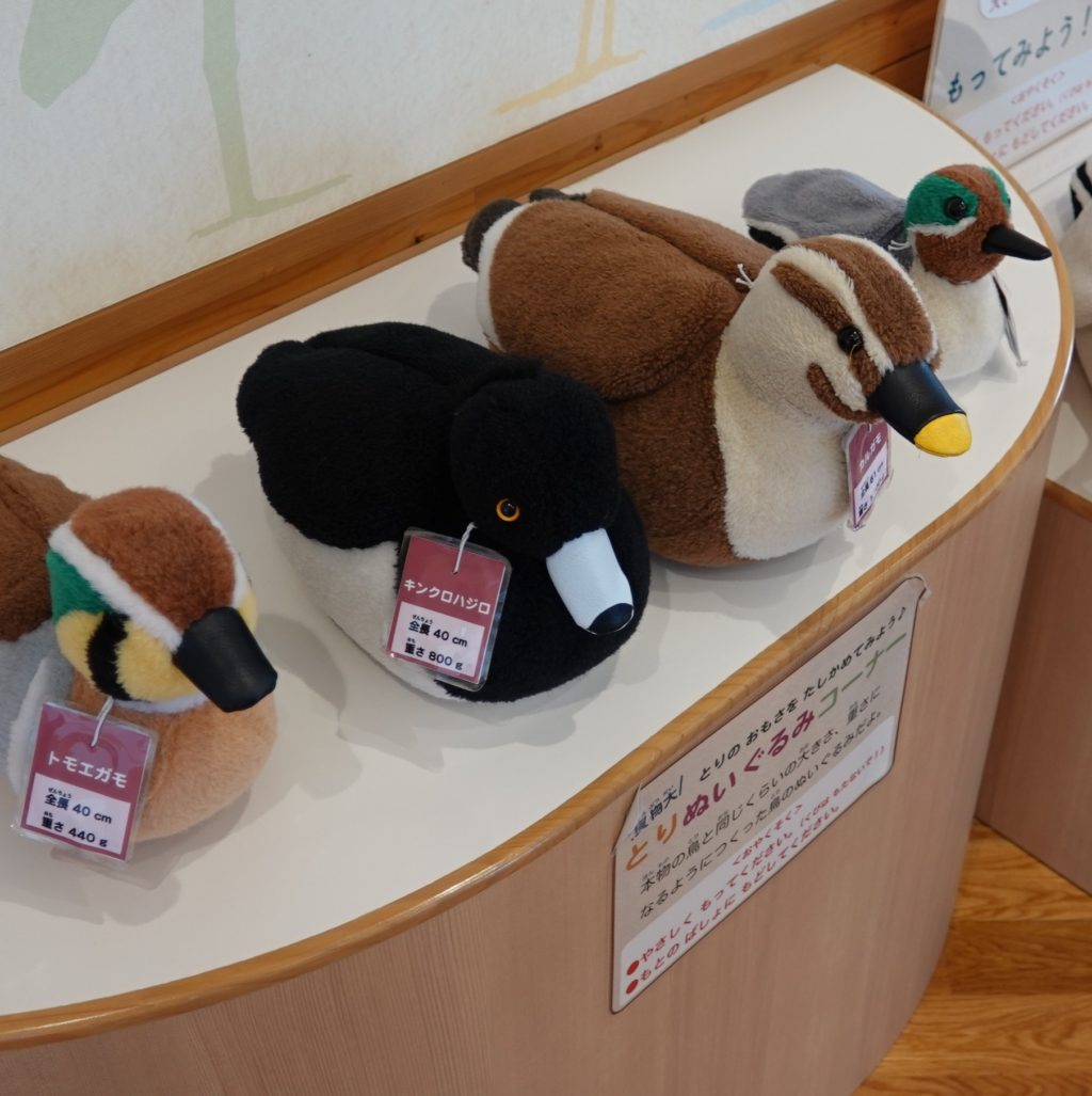 宍道湖のネイチャーセンターは「ホシザキ」という地元の会社が企画運営されています。展示のぬいぐるみは大きさ重さ共に本物に合わせて作られています。奥から順に コガモ カルガモ キンクロハジロ トモエガモ。なかなか可愛い!