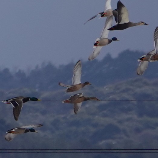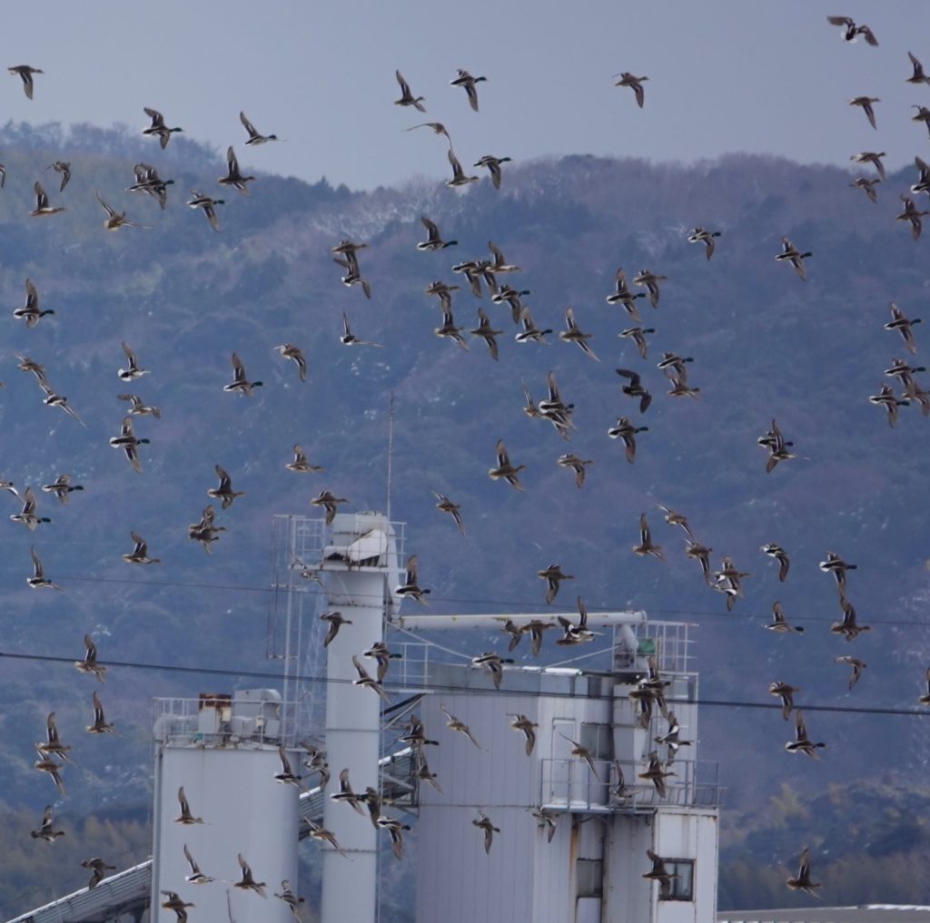 宍道湖の方も大した野鳥は見られず、少々気落ちして宍道湖の西岸の斐伊川(ひいがわ)なぎさ公園に向かいました。近づくと煙のように立ち上がる群れがあり、大量のカモがいました。チュウヒ・ノスリなど猛禽類の飛翔があり、カモたちが大騒ぎの様子です。マガモが多くヒドリガモ・カルガモが混じっていました。