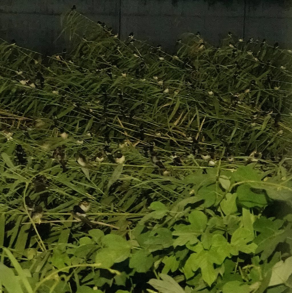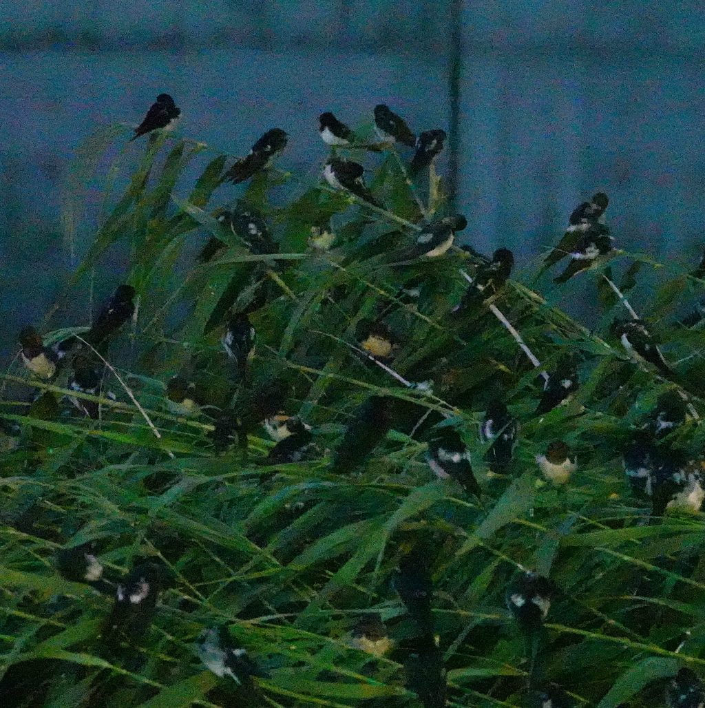狭い池に密集しています。クズが繁茂していますが、除去が間に合わずヨシが押されているそうです。ツバメはクズにはとまりません。現地で調査している方の情報では今年の数は約1万羽との事です。(2018年8月9日は大阪自然史博物館資料では1万4千羽の記録)。