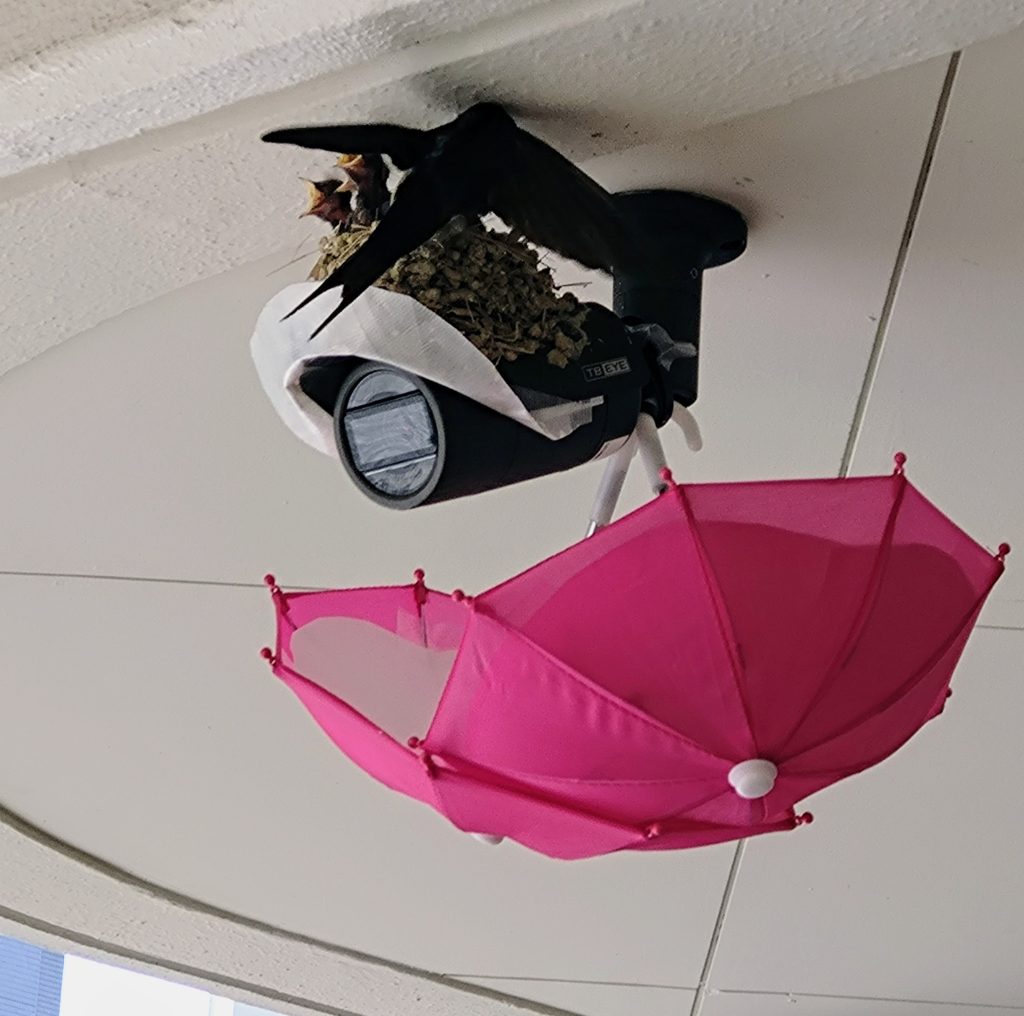 左の写真は8月10日にねぐら入りの観察の時に撮った写真です。ヨシにとまらず電線でねぐらをとるツバメもいます。右は北大阪急行線 千里中央 セルシーで子育て中のフン害を防ぐために管理者が設置した特注の赤い傘です。私の知る限り5か所はありました。昨年までは通常の傘をフン害予防に使われていましたが今年からはミニ傘に変更されました。道行く人々が「可愛い!」とスマホ撮りされていました。