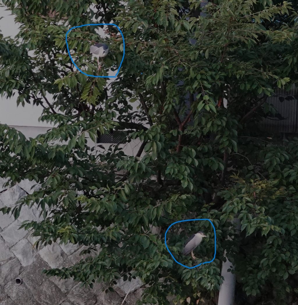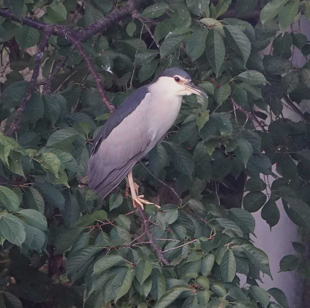 ツバメたちと入れ替わるようにゴイサギが飛んできました。池に張り出した樹木にひっそりととまりました。この池はフェンスが張り巡らしてあるので、安心感があるように思います。