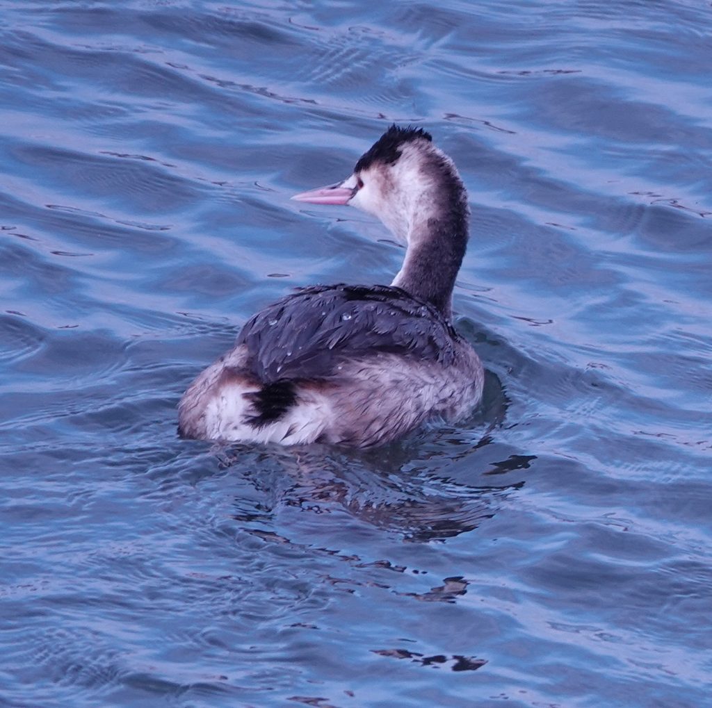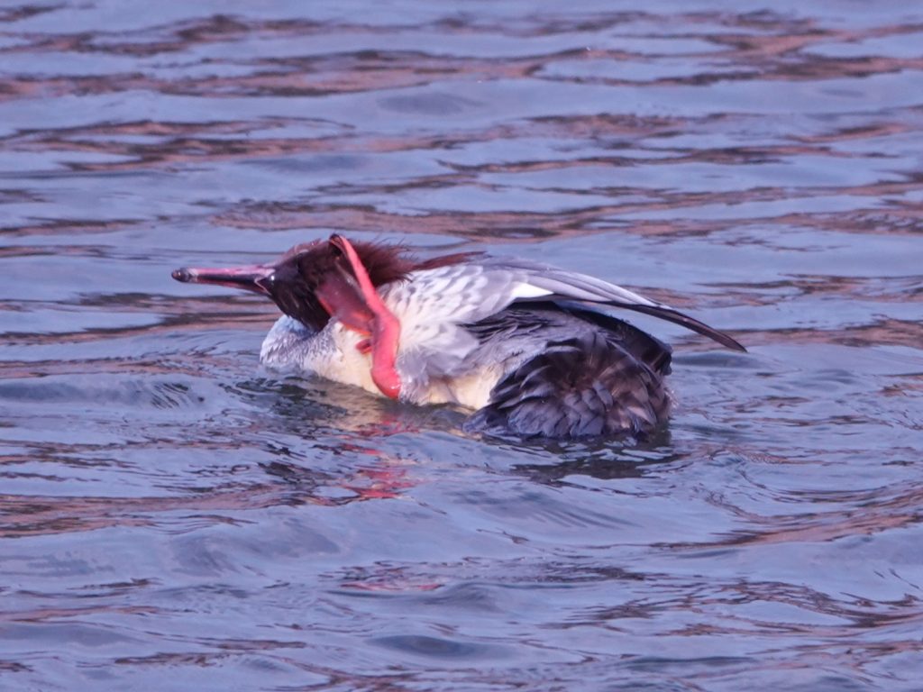 賀茂川で観察したカワアイサは全長65センチでカルガモより一回り大きいカモです。冬になると渡ってきます。下流の淀川にもいますが、近くでは観察できません。あいにくこの日は曇りでしたが、晴れの日はオスの頭は緑色に輝きます。