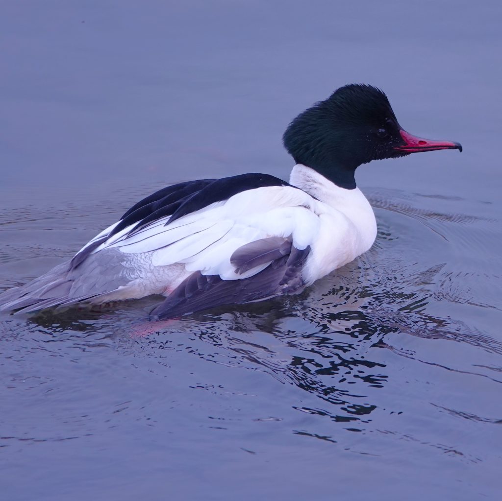 賀茂川で観察したカワアイサは全長65センチでカルガモより一回り大きいカモです。冬になると渡ってきます。下流の淀川にもいますが、近くでは観察できません。あいにくこの日は曇りでしたが、晴れの日はオスの頭は緑色に輝きます。