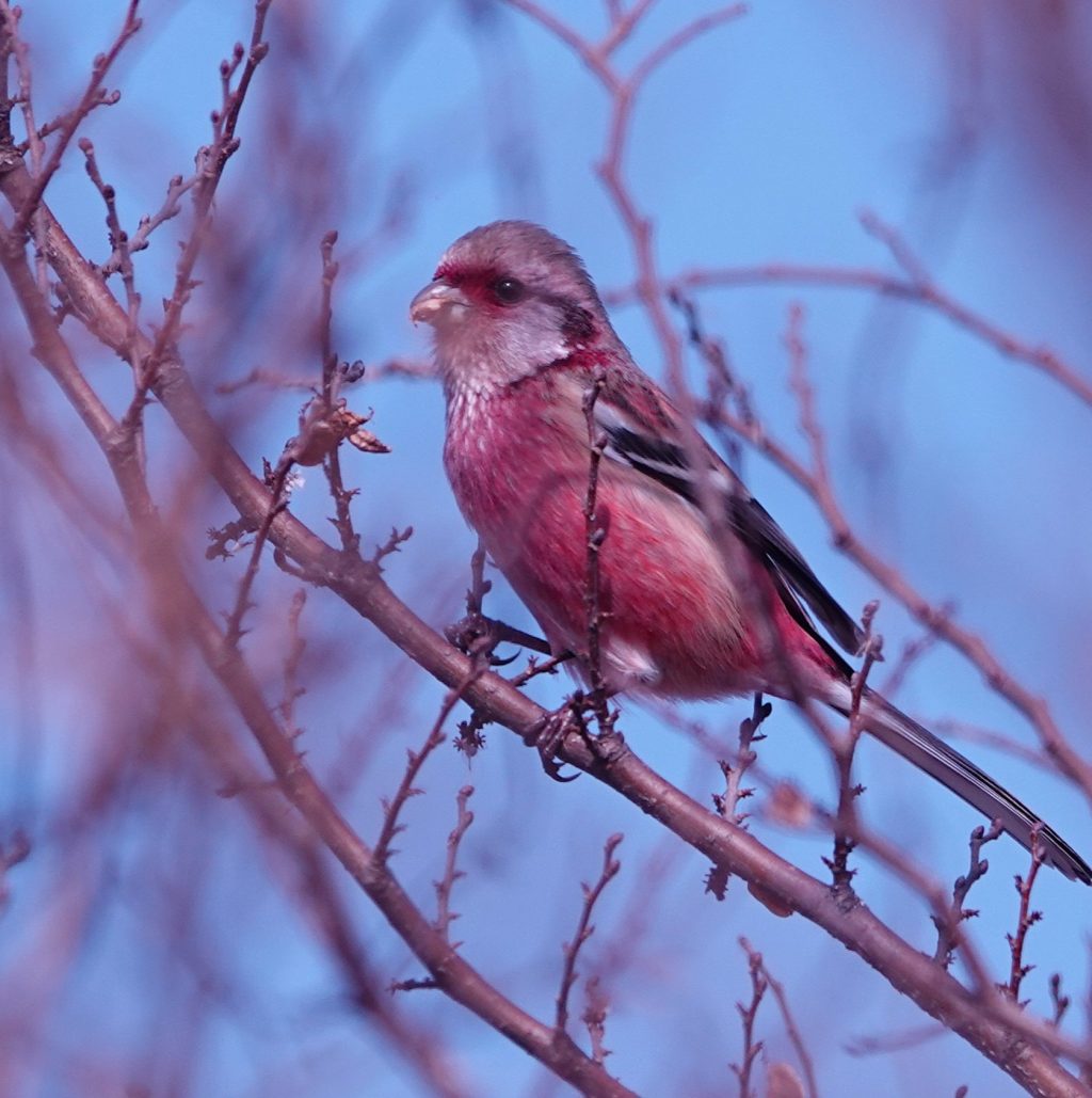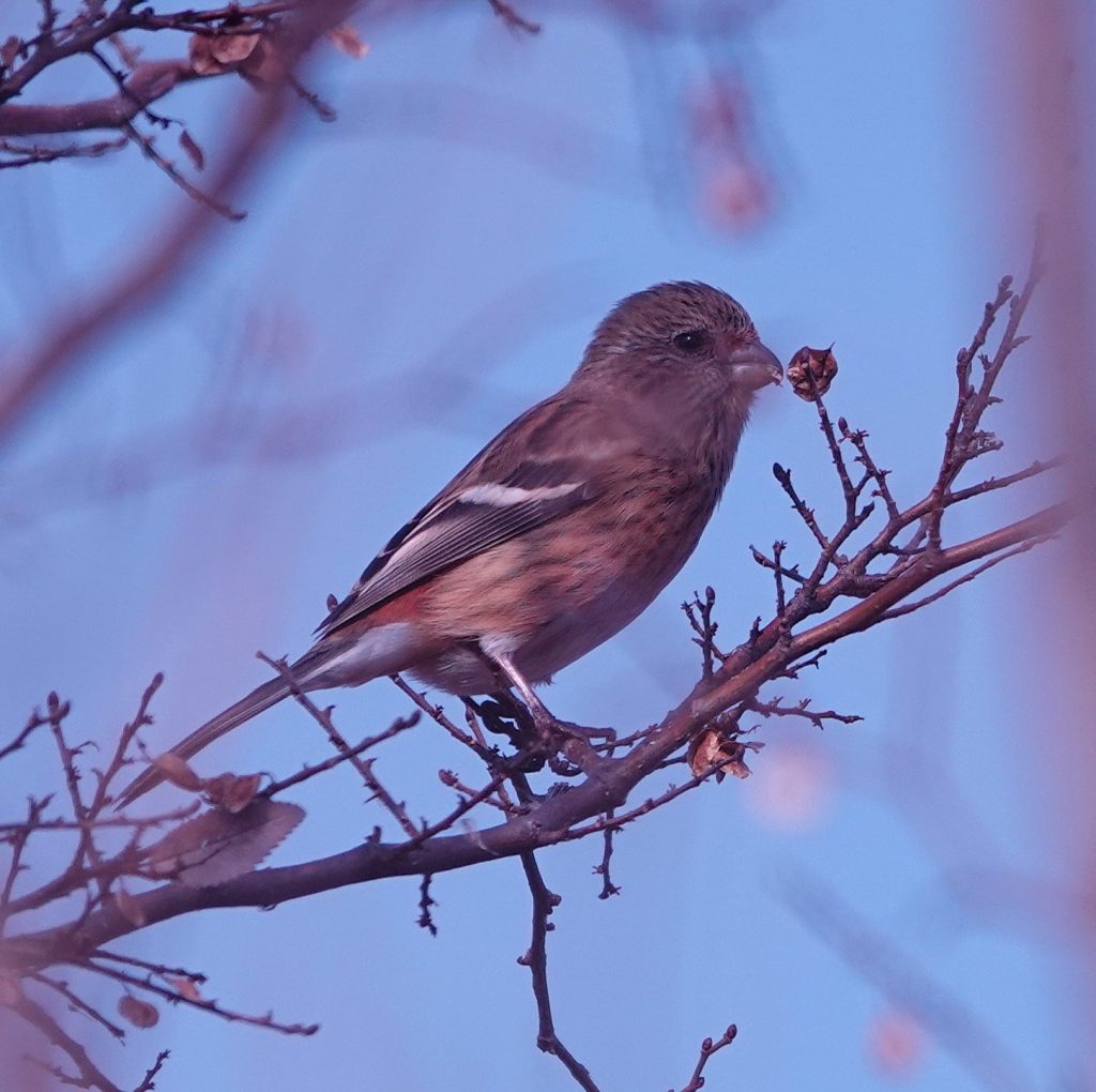 一人で少し不安だったのですが、最後にベニマシコを観察できることができて、気分は最高に盛り上がりました。啄んでいるのはアキニレかな?