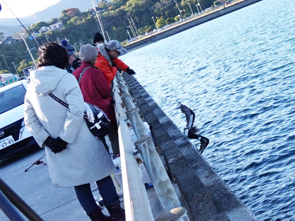 港では「ブリ」が釣れるということで釣り人が大勢おられました。生き餌に地元では「さっぱ」といわれる魚を釣り針に着けて泳がせます。それを狙ってなんとカツオドリが釣れてしまうというハプニングがありました。
