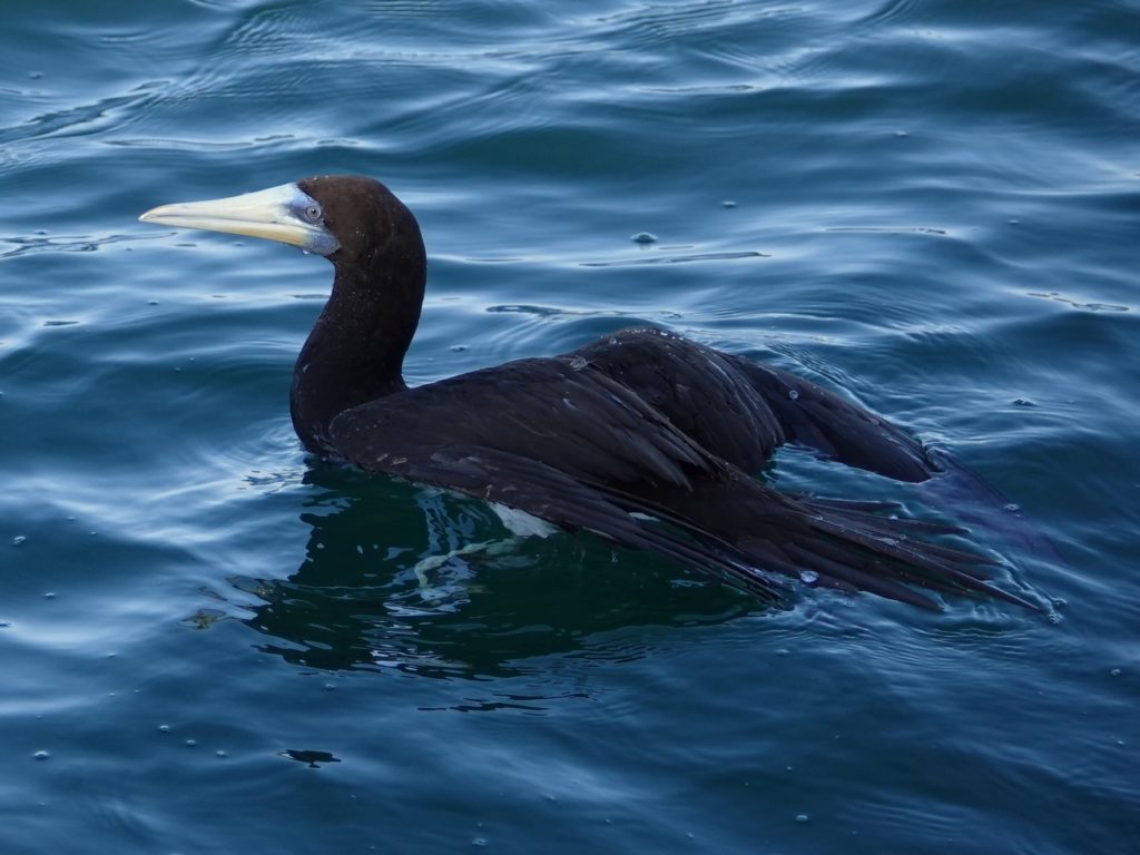カツオドリは広く太平洋・インド洋・大西洋に分布する魚を食べる鳥です。(カツオばっかり食べるわけではなさそうです)69cmですからカラスよりも大きな鳥です。日本では、鹿児島県の谷山港には毎年冬鳥としてやって来るのだそうです。私たちが来たときは20羽位でしたが、前日は80羽ほど飛んでいたそうです。