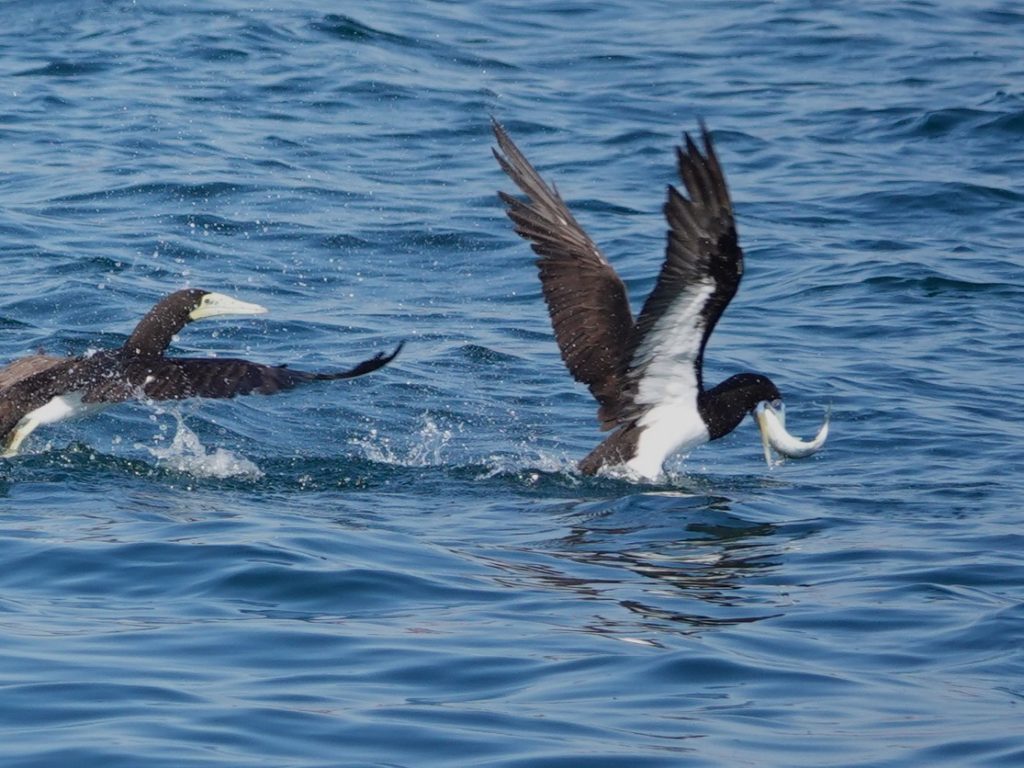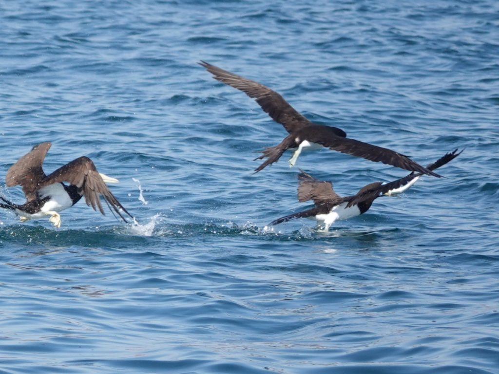 カツオドリは豪快にダイビングしますが、ほとんどは失敗で魚を逃していました。仲間が捕まえた魚を横取りするのは日常茶飯事のようです。カツオドリのオスメスは顔の色で見分けます。顔が青いのは雄。薄黄色いのはのは雌です。