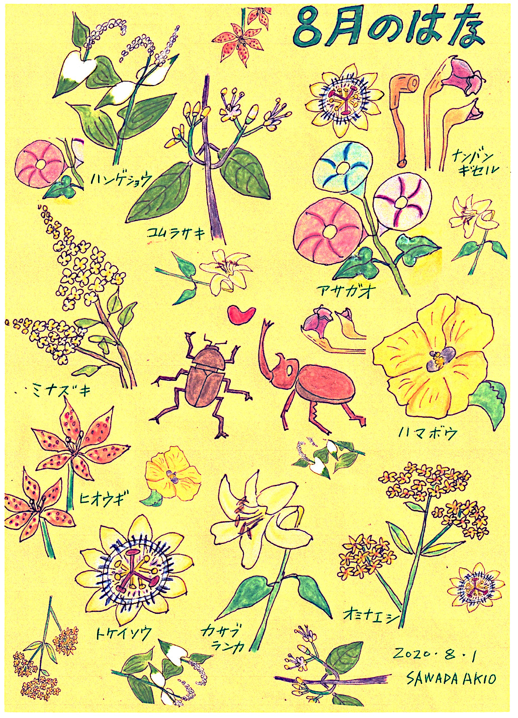 「8月のはな」届けます。今月の中心はカブトムシ、実は昨年春に石清水八幡宮で求めたもの7月に成虫