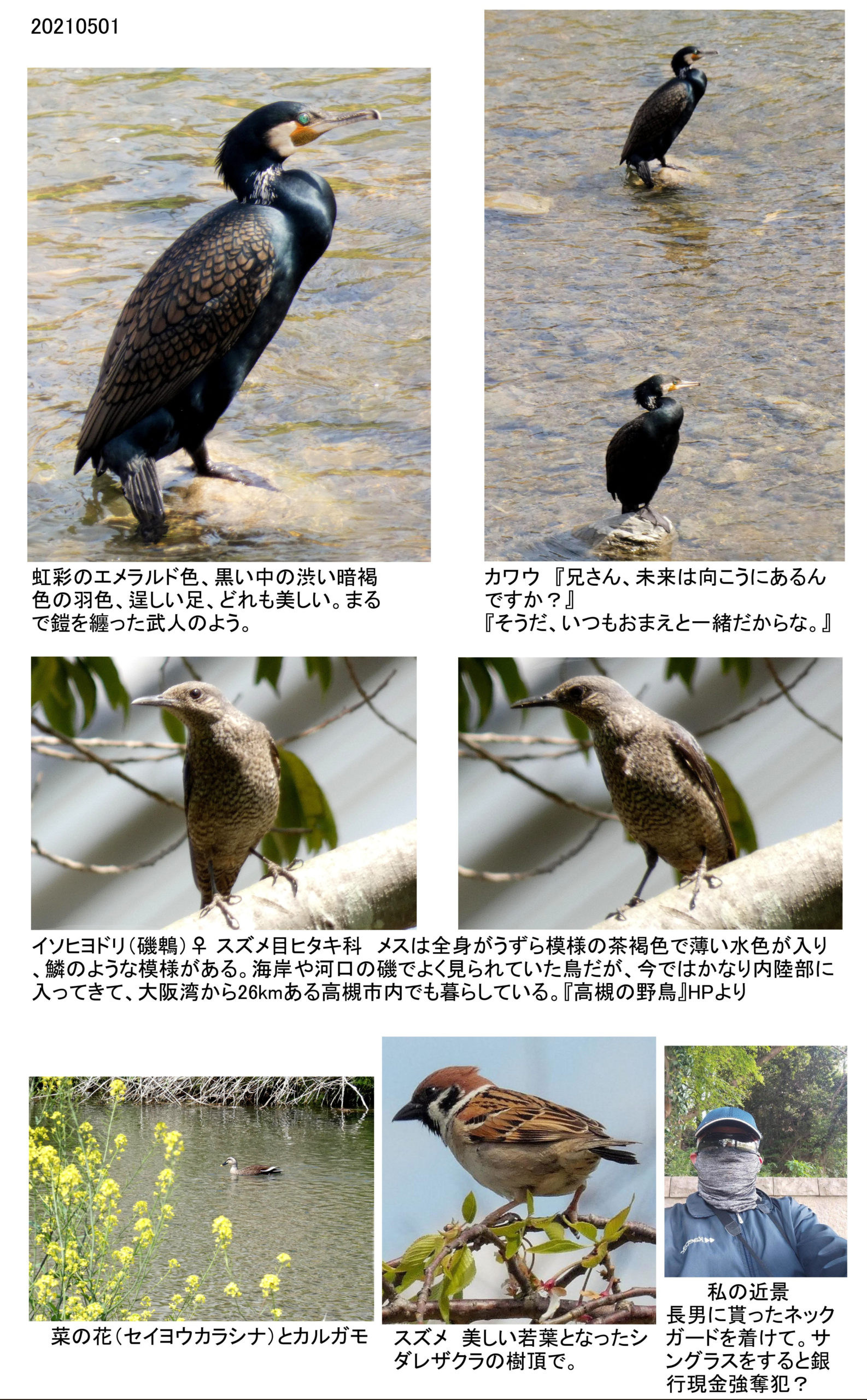 拙い写真記録を添付します。これは日ごろ周辺の野鳥を記録した中の、最近こころに残った鳥たちです。まるで鎧を纏った武人のようなカワウや、かなり内陸部に入ってきて、大阪湾から26kmある高槻市内でも暮らしているというイソヒヨドリ(磯鵯)♀〔と思うんですが〕。間違いがありましたら、またお知らせください。