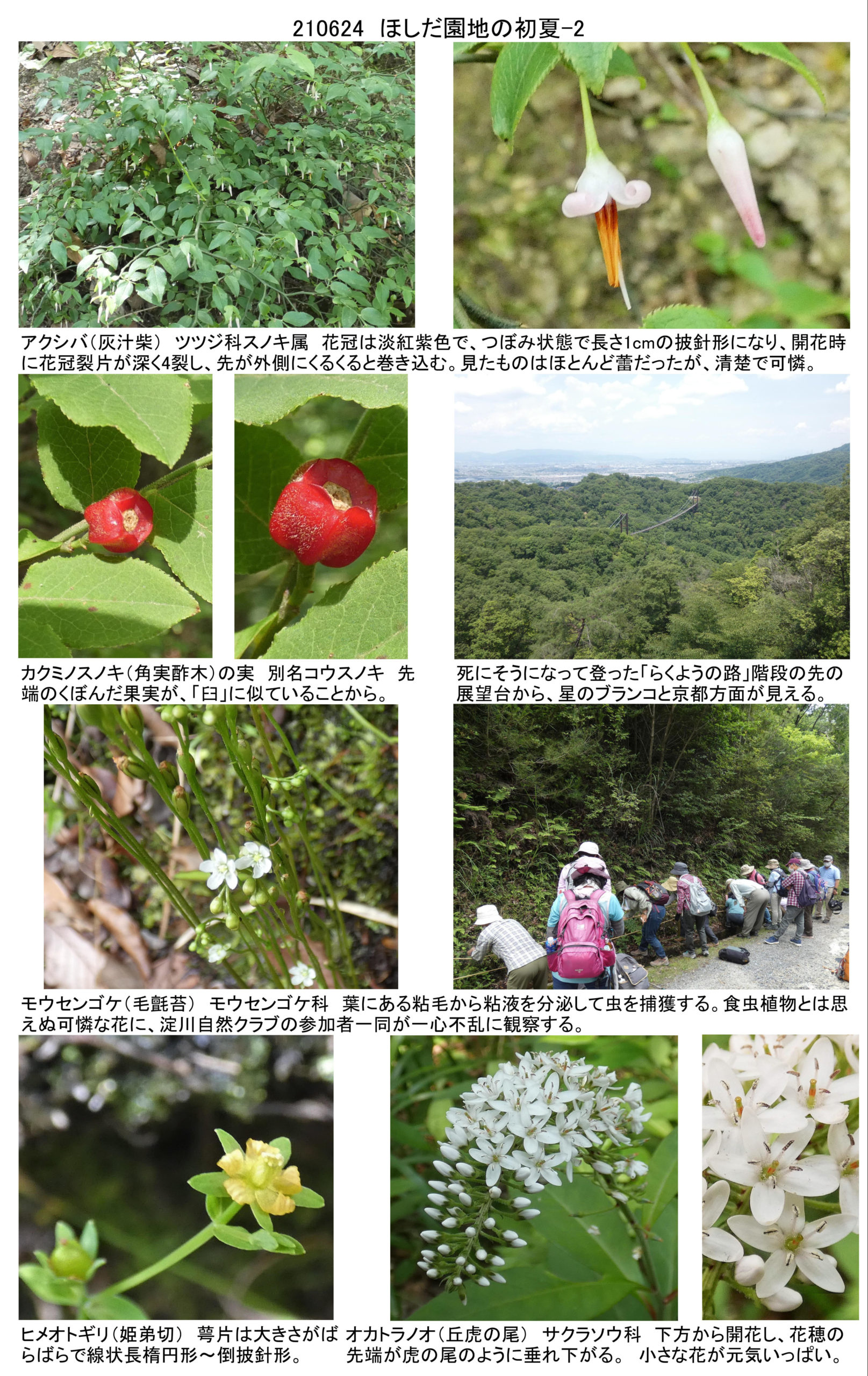コロナについて最強の年寄りの一人になったことをいいことに、早速6/24私市のほしだ園地へ淀川自然クラブの自然観察会へ行ってきました。「らくようの路」の木で作られた階段は千段か二千段(あくまでも個人の感想)。ウォーキングでは毎回最後に百段の階段を休まず登るようにしているのですが、なかなか。80歳代の方もいる中、リタイヤはできません。死にそうになりました。未熟さを恥じます。
