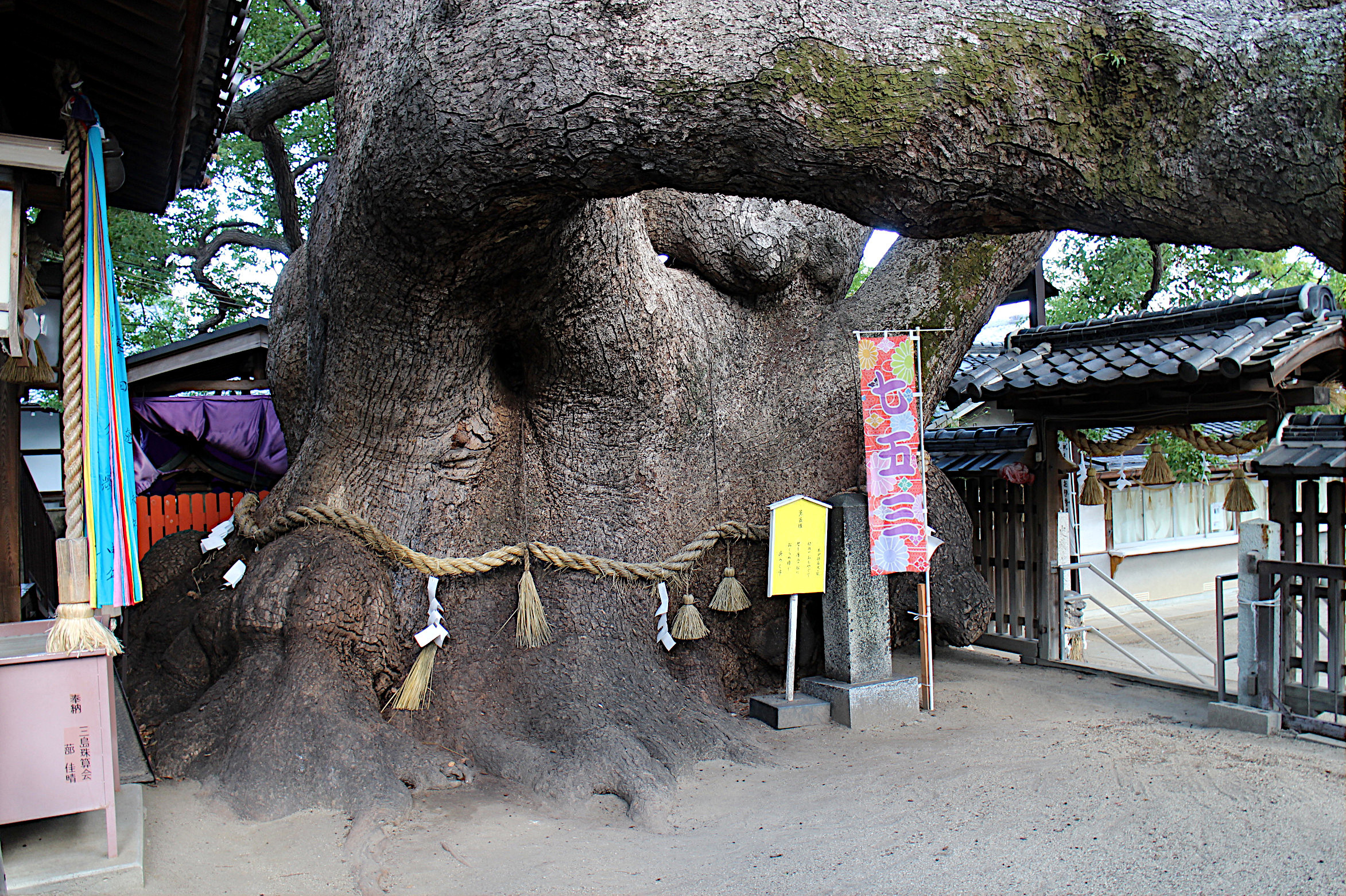 大阪メトロ鶴見緑地線の門真南駅から北東へ徒歩15分の所に三ツ島神社があります。小さな神社ですが、写真のように神社の中央に「薫蓋樟」という名前のクスノキがどっしりと座っています。 国指定天然記念物で、幹回り13.1mで樹齢が約1500年だそうです。