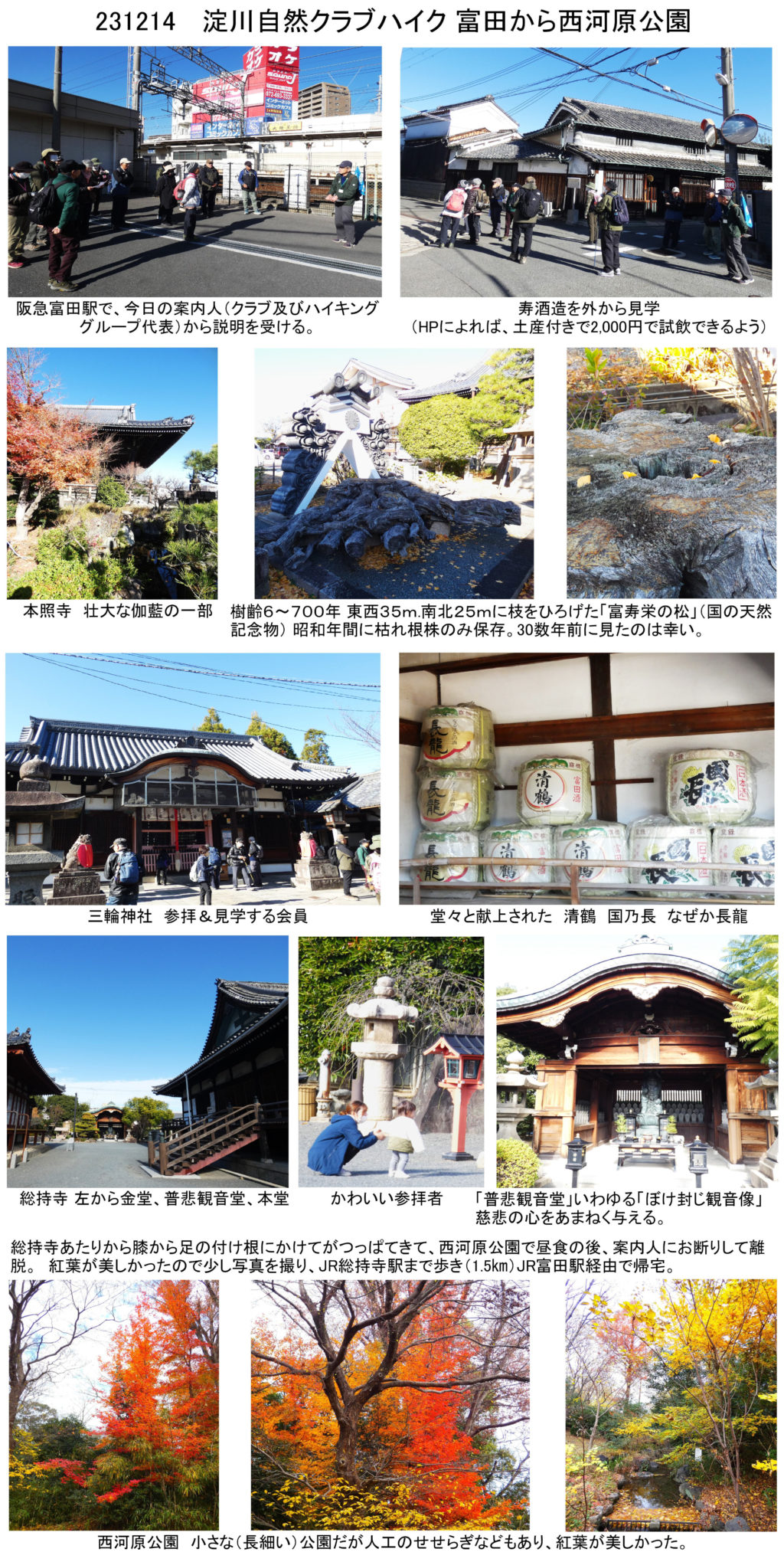 私は、まだ暖かった先週231214淀川自然クラブハイクキング「高槻から元茨木川緑地」に行ってきました。コースは、富田駅→寿酒造→本照寺→筒井池公園→三輪神社→総持寺→西川原公園→元茨木川緑地です。