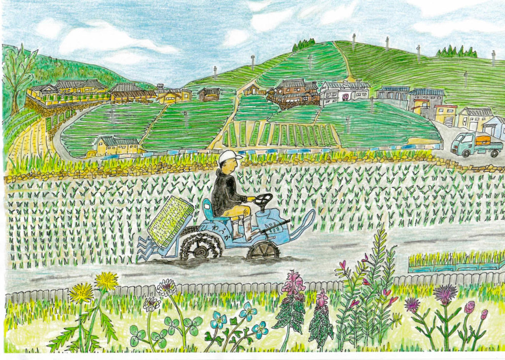 素敵です!力作です!一つ一つ植えられた稲の赤ちゃんがとても生き生きとしています。おじさんの表情もほんわかと暖かいです。