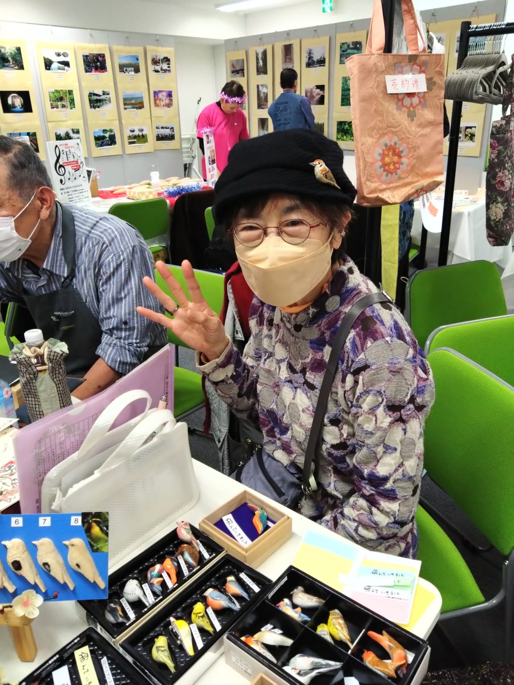 先生の山積みの作品はサクサクと売れて、その流れで私の作品も思った以上に販売できました。1羽1羽精魂込めて作った作品なので寂しいような、うれしいような気持ちです。購入していただいた方に末永くかわいがって頂ければ幸いです。ありがとうございました。