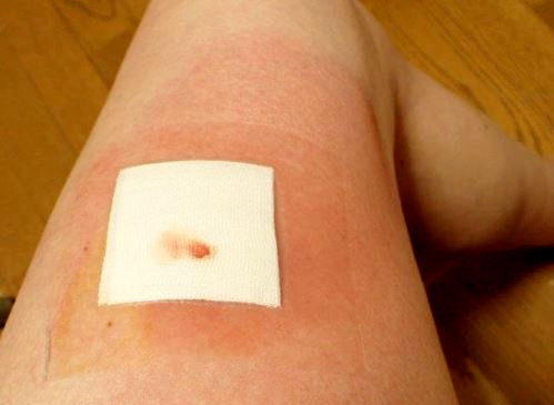 帰って着替えた時は全く気付かず、夕方に太ももが直径10cm程赤くなっている。真ん中に1mm程のかさぶた? 手では取れず、もしかしてと。日曜の夜の事で病院さがしに一苦労。結局噛まれている箇所を切除(3針縫いました)。