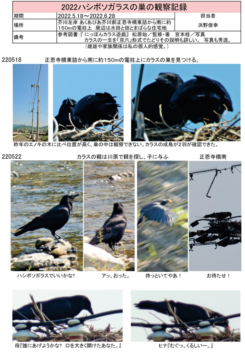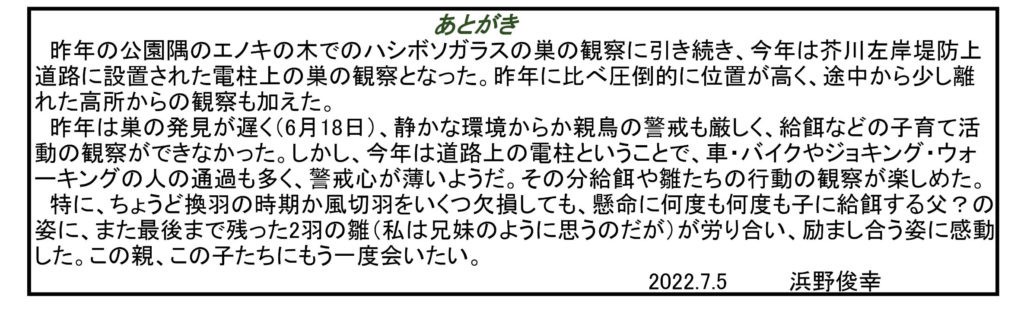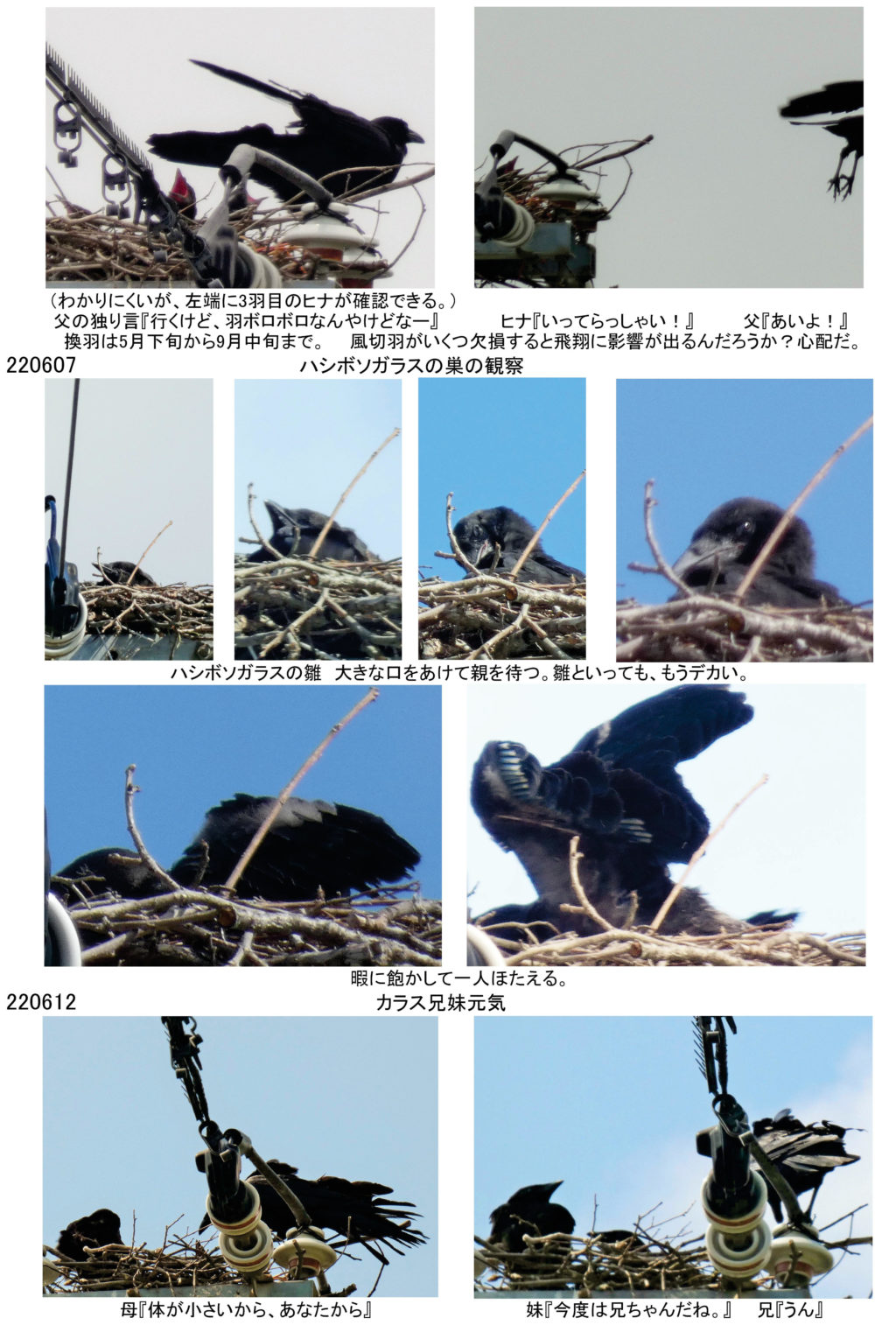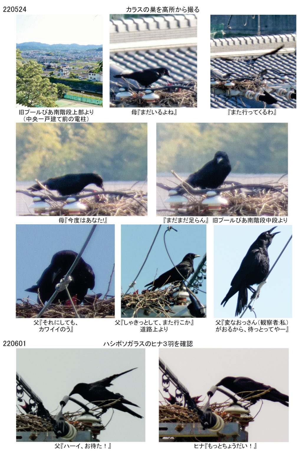 それに今年は、カラスに加え「チョウゲンボウの雛」や「ハトの巣の観察」と、現在進行中のものもあり、楽しさ3倍増です。 くれぐれも熱中症に気をつけて、皆さまも引き続き元気に活動されることを祈ってます。