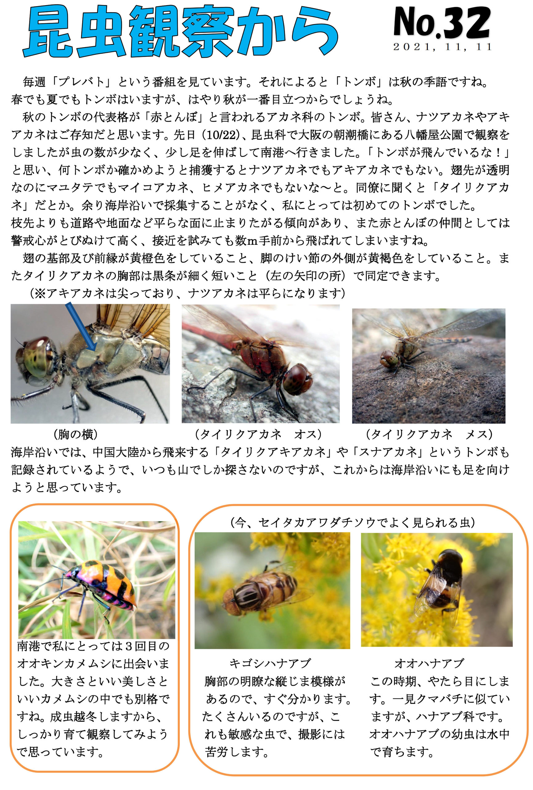 外へ出ても虫に出会えることが少なくなり、虫好きにとっては活動面でも冬の季節に突入です。家では撮影した写真の整理しつつ、名前探しです。コロナの感染数も少なくなってきましたので、紅葉狩りとしばらく訪れていなかったもう一つの趣味「お寺まわり」をしようと思います。添付写真は、タイリクアカネがいた「大阪南港」です。のんびり船を眺めるのもいいですね。