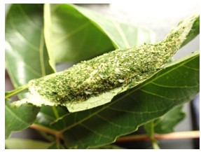 これは以前に持ち帰り、シンジュの葉を入れて飼育した蛹。幼虫をケースに入れ観察中に脱走?部屋で羽化されると今後部屋での飼育禁止が出そうで困るなぁと。ケースの中から葉を利用した蛹があり一安心でしたが、隠れ方はホント見事。