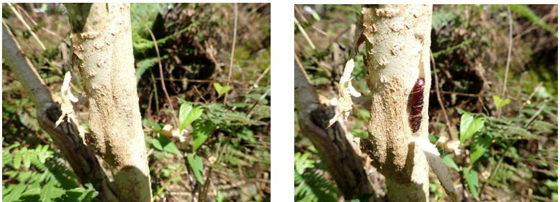 下の2枚が、野外での本来の蛹の状態(9/30撮影)左:幹に木の皮を利用して作った蛹が3個あります。少し盛り上がっています。右:1個の皮を剥ぐと中から蛹。