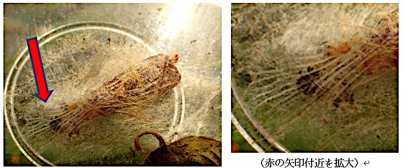 蛹が音を出す仕組みの写真です。メンバーから教えてもらい家でケースに何も入れなかった状態で作られた蛹を見ると「なるほど!」と納得できます。蛹の尾の部分は縦の糸で横糸が少ないですね。弦楽器と同じ原理で、蛹が尾を振ると音が鳴ります。