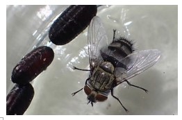 この日、皮を剥ぎ出て来た蛹は持ち帰り。2日後ケースの中にはメンバーから聞いていたハエの卵がありました。音を出し敵が近づかないように驚かせ、完璧にカモフラージュしたと思える状態の蛹でも、ヤドリバエの仲間に寄生されていたんですね。自然界の厳しい一面です。(このハエはメンバーが撮影したもの)