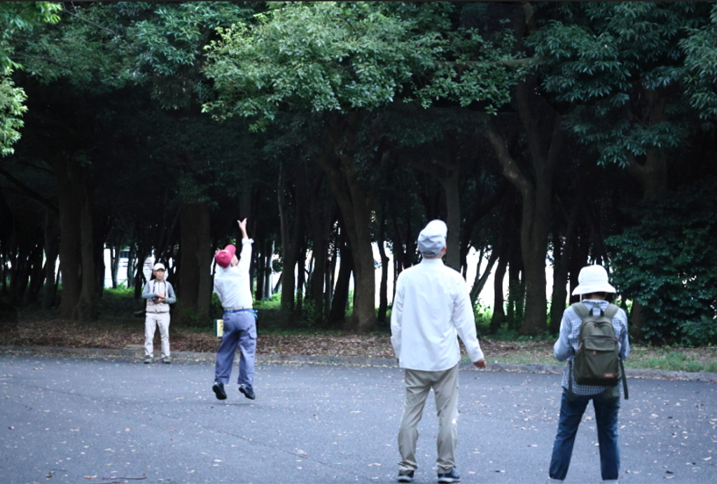 添付写真:「トンボ釣り」の様子(会長の見事な投球)