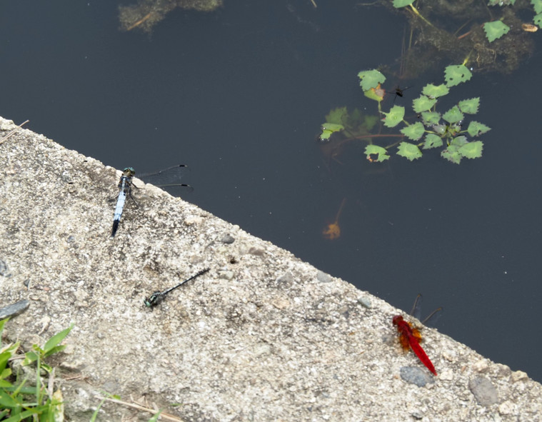 池の石堤に3種のトンボが止まっていました。 しばらく眺めていると、この3匹は縄張りに入って来たオスを追い払うため飛び立ってはいましたが、それ以上の危害を加えることなく、すぐこの場所に戻って仲良く日向ぼっこ。