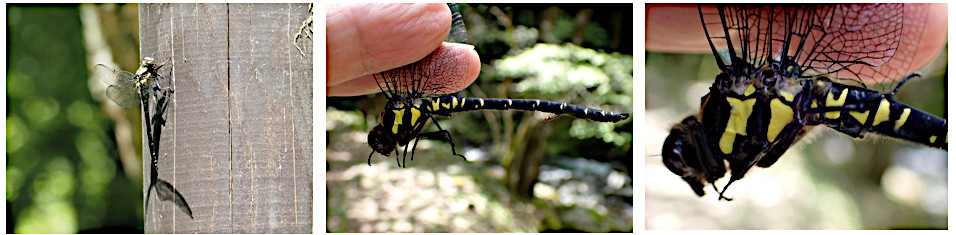 ムカシトンボを見てから1週間後、ミヤマカラスアゲハの出現時期にも入って来たのと同時に、もう一度ムカシトンボを見たいと再び同じ兵庫県と鳥取県の県境へ遠征。クマに遭遇しないことを願いつつ山道を一人トボトボ歩きながら案内の看板を見ると、その支柱にトンボが止まっているのを発見。まず遠くから撮影後、気づかれないように近づき網で捕獲。セミのように止まっているので、もしかしたらと思いつつも携帯が圏外で使用できず、持参していたポケット図鑑で確かめると案の定「ムカシヤンマ」でした。