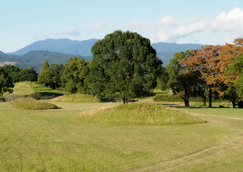 添付は大クス(2枚)と西都原古墳群、高千穂河原(奥の山に、ニニギノミコトが高千穂に降臨した際に刺したと言われる天逆鉾が突き刺さっています)