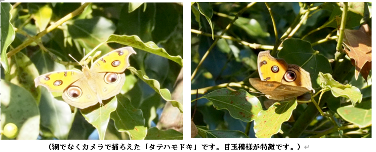 宮崎県西都原で古墳を見ている時に「キタテハが飛んでいるわ」と思っていたのですが、よく見ると目玉模様が見えました。網は機内に持ち込めないと思っており、飛行に乗る時は持って行かないんですよね。古墳群を見て回っていると、たくさん飛んでおり、目の前の葉にも止まるので何度も帽子で捕獲しようと試みたのですが所詮相手はチョウ。絶対無理ですね。