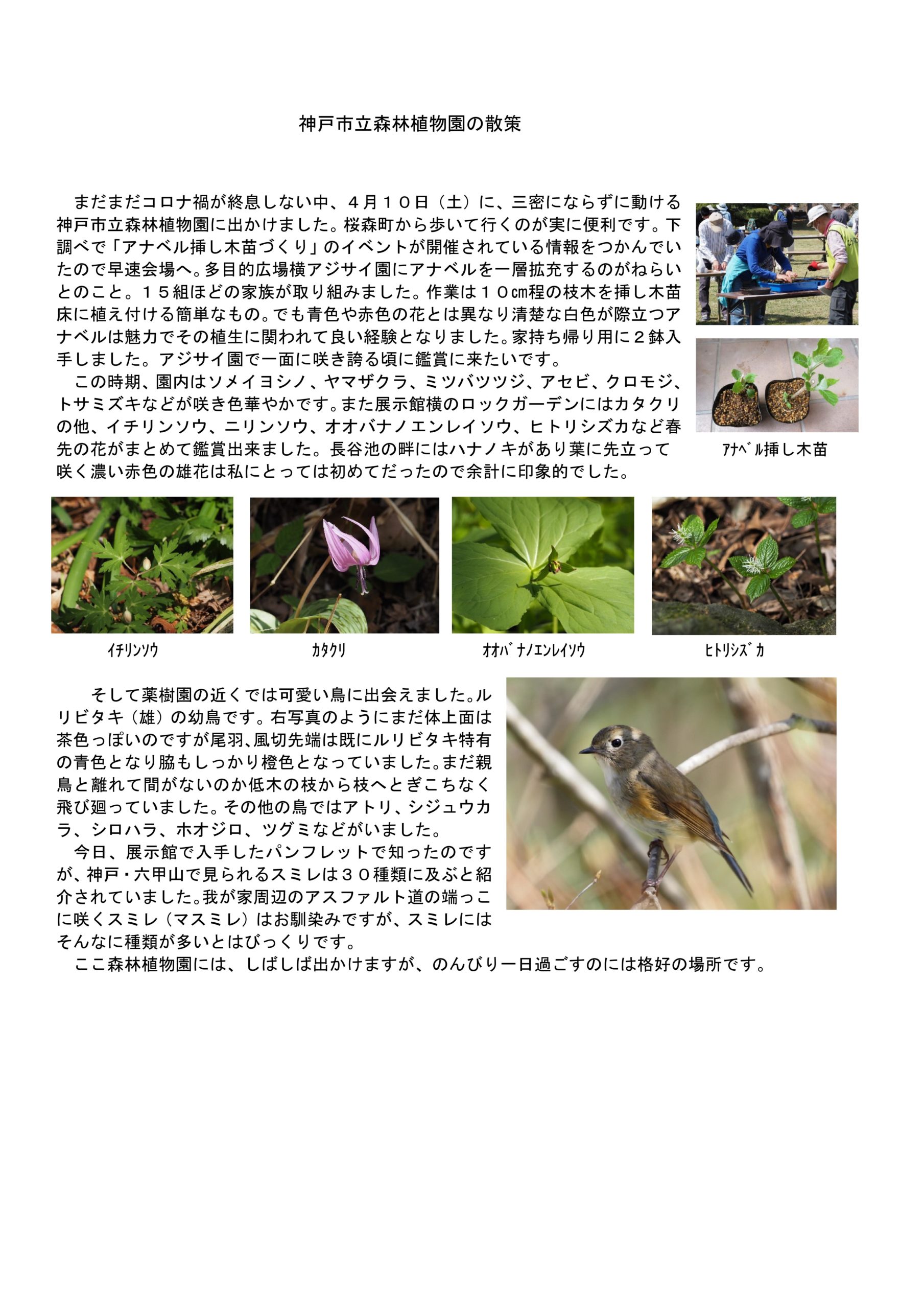 まだまだコロナ禍が終息しない中、4月10日(土)に、三密にならずに動ける神戸市立森林植物園に出かけました。桜森町から歩いて行くのが実に便利です。下調べで「アナベル挿し木苗づくり」のイベントが開催されている情報をつかんでいたので早速会場へ。多目的広場横アジサイ園にアナベルを一層拡充するのがねらいとのこと。15組ほどの家族が取り組みました。作業は10㎝程の枝木を挿し木苗床に植え付ける簡単なもの。でも青色や赤色の花とは異なり清楚な白色が際立つアナベルは魅力でその植生に関われて良い経験となりました。家持ち帰り用に2鉢入手しました。アジサイ園で一面に咲き誇る頃に鑑賞に来たいです。 この時期、園内はソメイヨシノ、ヤマザクラ、ミツバツツジ、アセビ、クロモジ、トサミズキなどが咲き色華やかです。また展示館横のロックガーデンにはカタクリの他、イチリンソウ、ニリンソウ、オオバナノエンレイソウ、ヒトリシズカなど春先の花がまとめて鑑賞出来ました。長谷池の畔にはハナノキがあり葉に先立って 咲く濃い赤色の雄花は私にとっては初めてだったので余計に印象的でした。