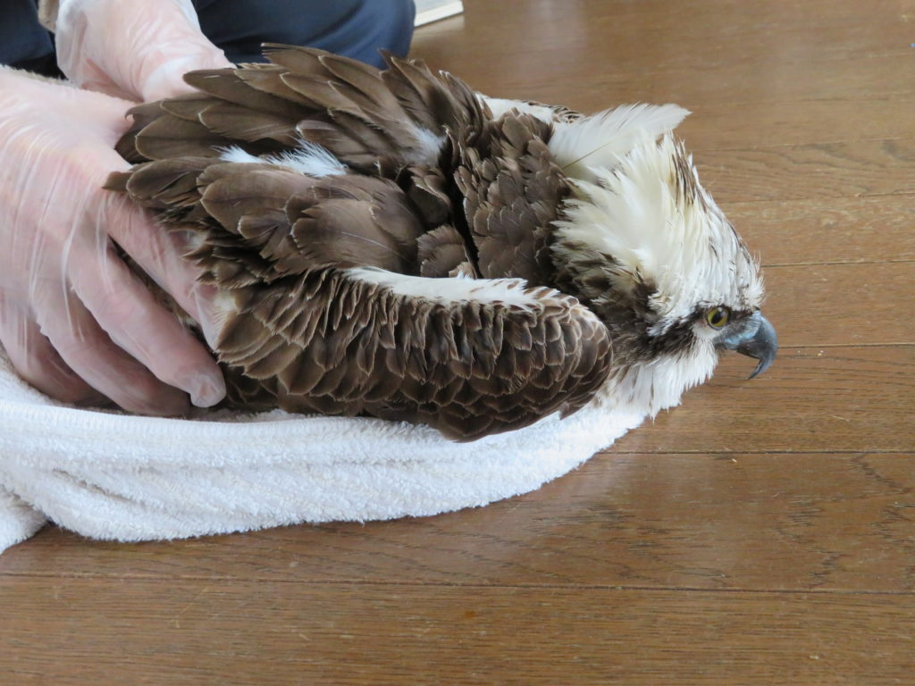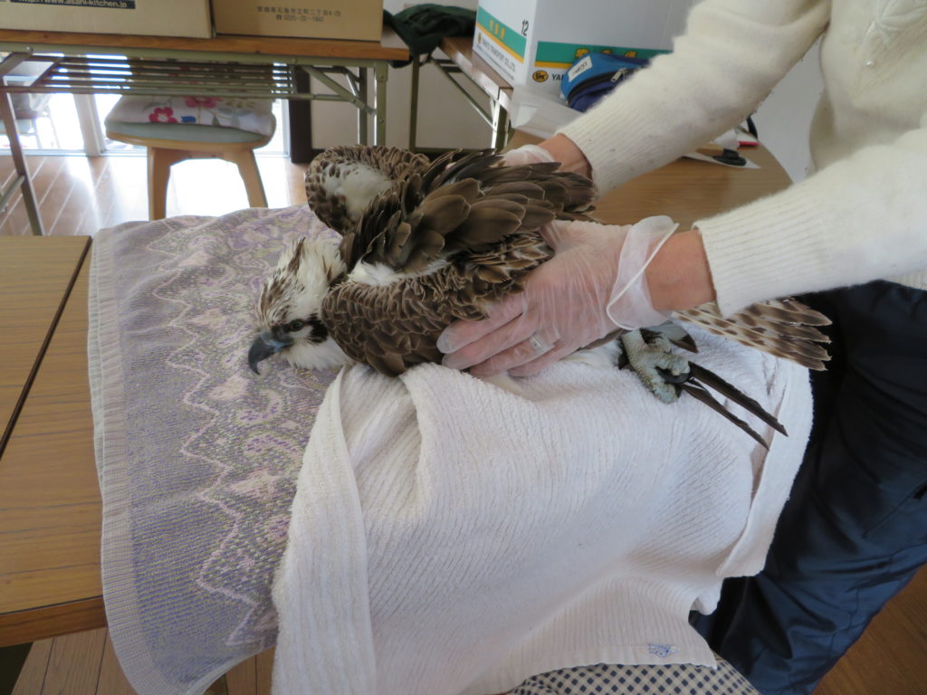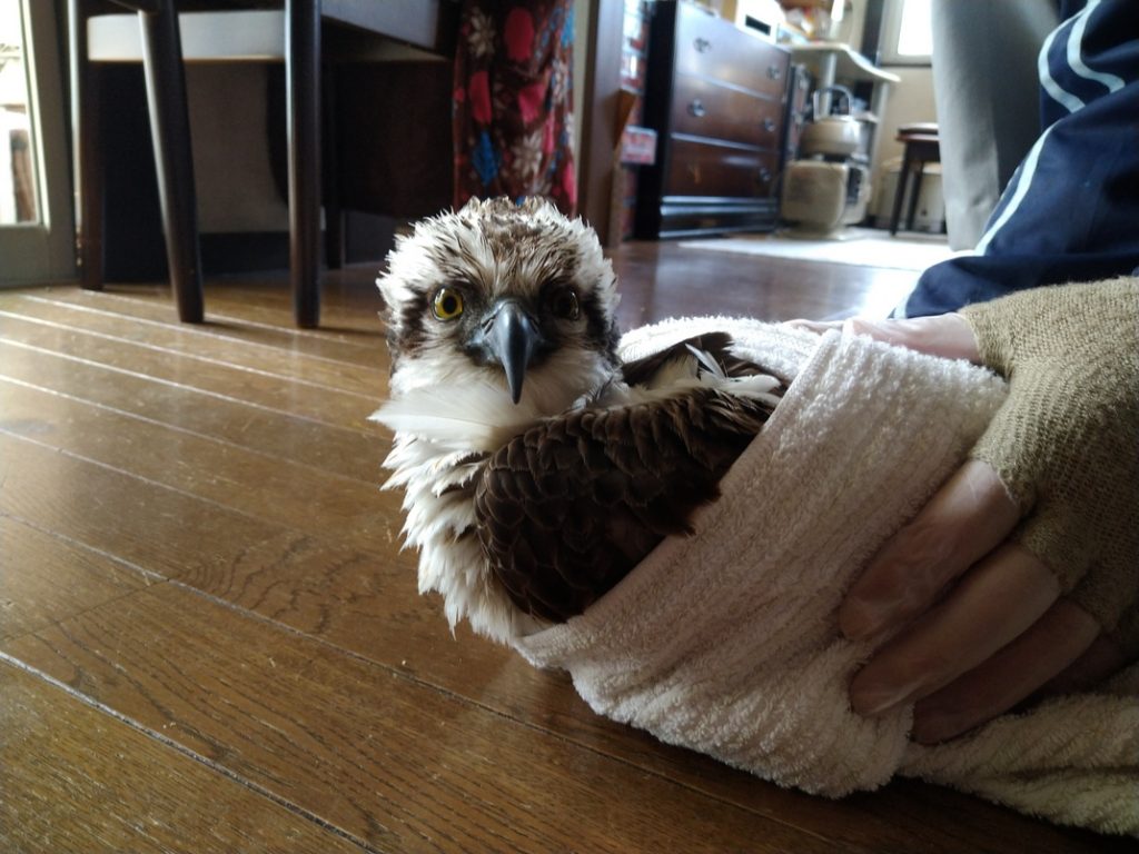 27日昼過ぎに駅から自宅へ帰る道でカラスの異様な鳴き声で気が付きました。この鳥はカラスに襲われて民家の植木の枝でぐったり羽根を広げた状態で、今にもカラス2羽がつっつこうとしていたのです。慌ててチャイムを鳴らし、戸を開けてもらって素手で捕まえてビニィール袋に入れました。ミサゴの幼鳥と思われます。力も弱く、肉付きもガリガリ。脇に抱えて家に向かったのですが、カラスはひつっこく追いかけてきました。
