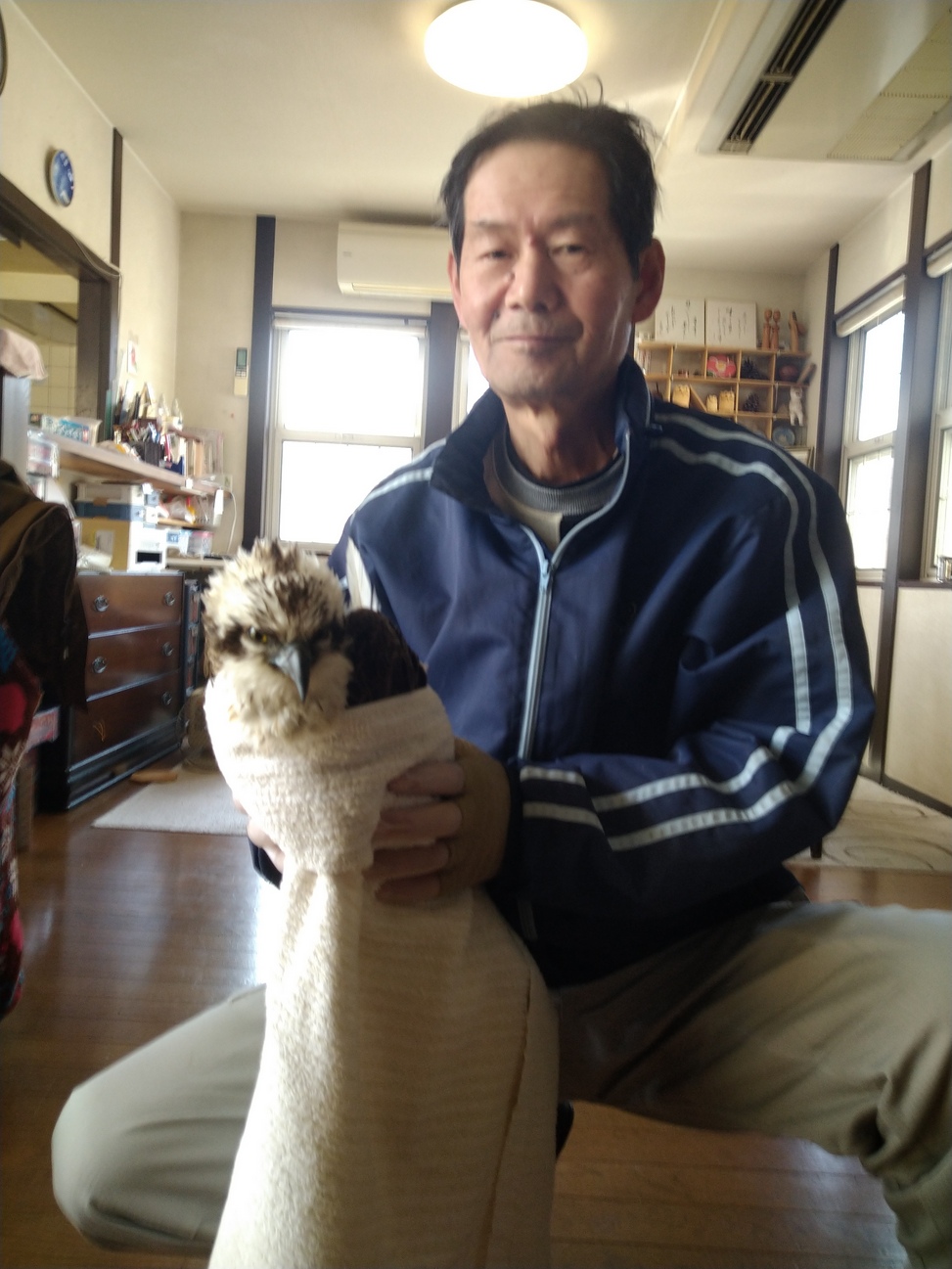市役所へ先ず相談したら、全く保護に前向きでなく、感じの悪い対応。次に、地元門真の警察事務所に相談すると、若い警察官2人が来て、事情の確認をして、前向きに保護する方向で関係機関へ連絡を取るという事になりました。上司2人がパトカーでミサゴを迎えに来てくれました。一時的には警察で保管して、保護先を見つけ次第、そこに移すということになりました。経過については後日連絡をもらうことにしています。野生の猛禽類を初めて手で触りました。目の鋭さはさすがです。家に来た警察官も初めての経験であり、興味深々の様子で、和やかな話し合いが出来ました。カラスに目をつけるぐらいですので、相当衰弱しています。後は元気になって生き延びてくれることを願うだけです。頑張れミサゴ!