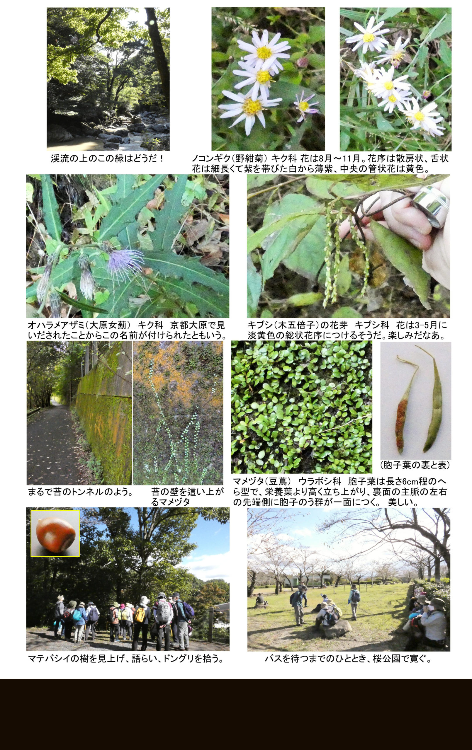 コースは上ノ口バス停 摂津峡大橋 白滝 八畳岩 塚脇バス停まで約3.5㎞。そう、2018/10/1の緑組第2回同窓会で、静谷さんが植物をいっぱい説明してくれたあの斜面からの出発でした。花は今一つ多くはなかったですが、いろいろな花の実が精一杯色づき、とても良かったです。もちろん帰りはバスに乗らず、塚脇橋より徒歩で帰宅しました。