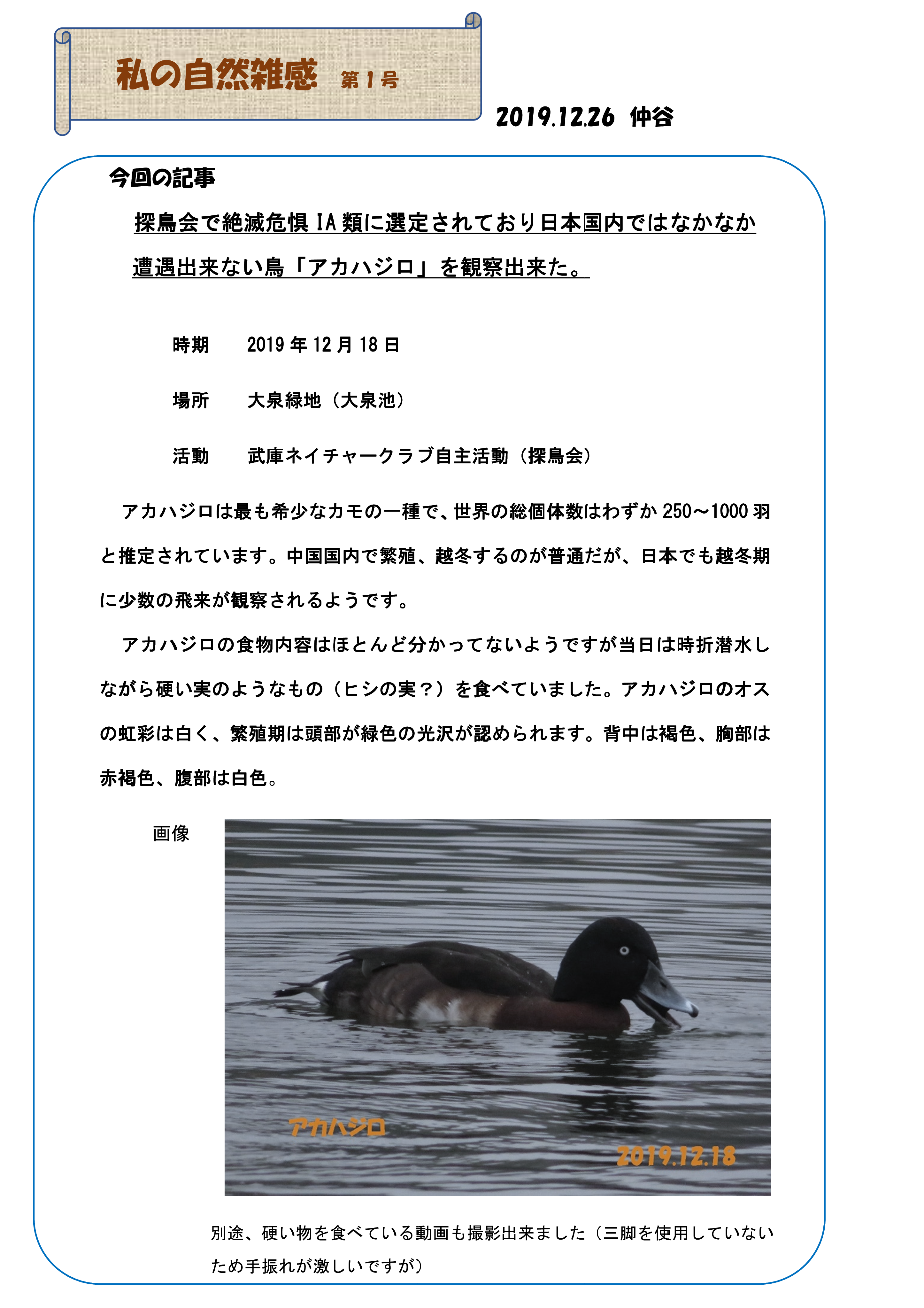 2019年12月26日 / 最終更新日時 : 2020年1月19日 midori24-2 野鳥 私の自然雑感 No1 (アカハジロ) 気楽な内容で投稿に参加します。探鳥会で絶滅危惧IA類に選定されており日本国内ではなかなか 遭遇出来ない鳥「アカハジロ」を観察出来ました。 私の自然雑感191218大泉緑地ダウンロード Copy コメントを残す コメントをキャンセルメールアドレスが公開されることはありません。 ※ が付いている欄は必須項目ですコメント ※ 名前 ※ メール ※ サイト 次回のコメントで使用するためブラウザーに自分の名前、メールアドレス、サイトを保存する。