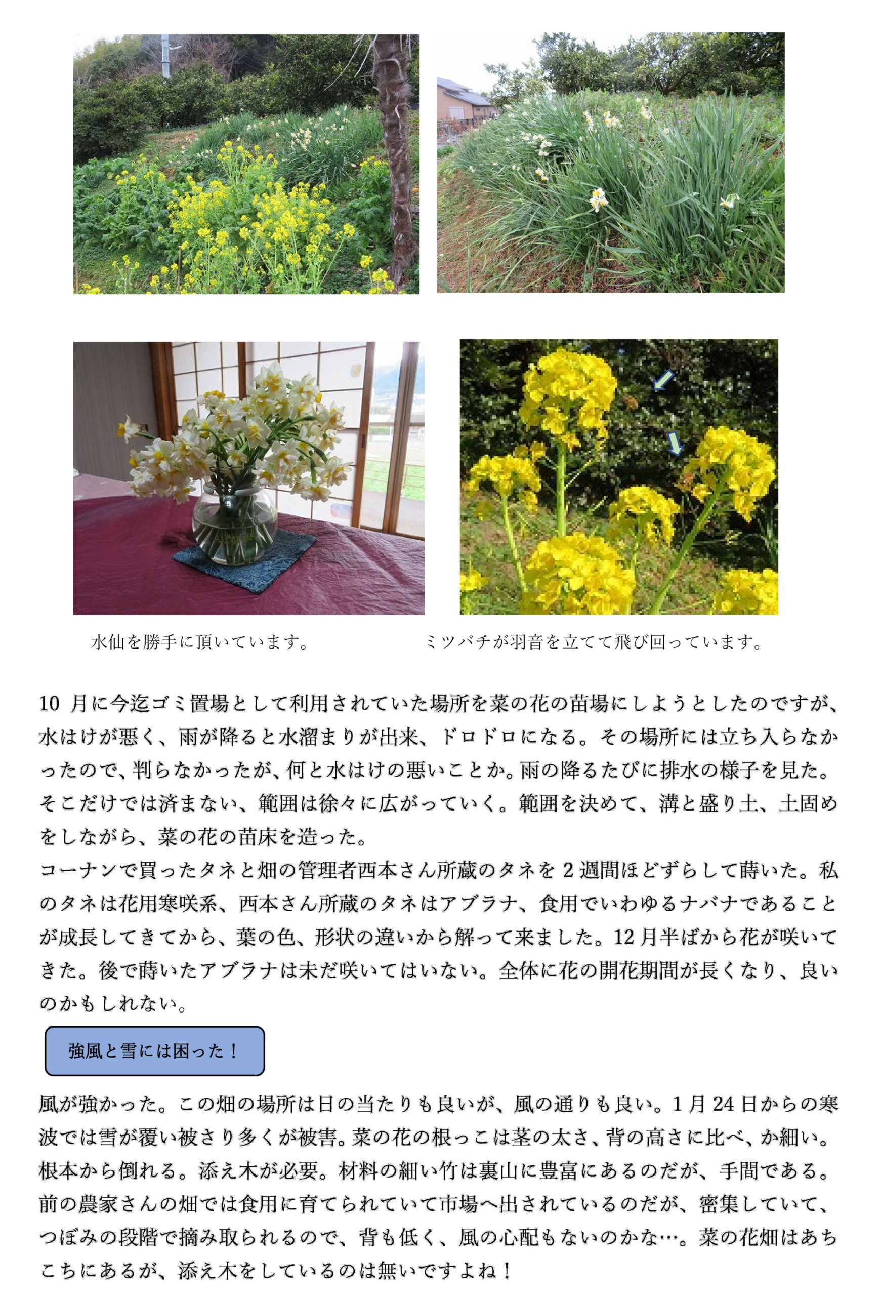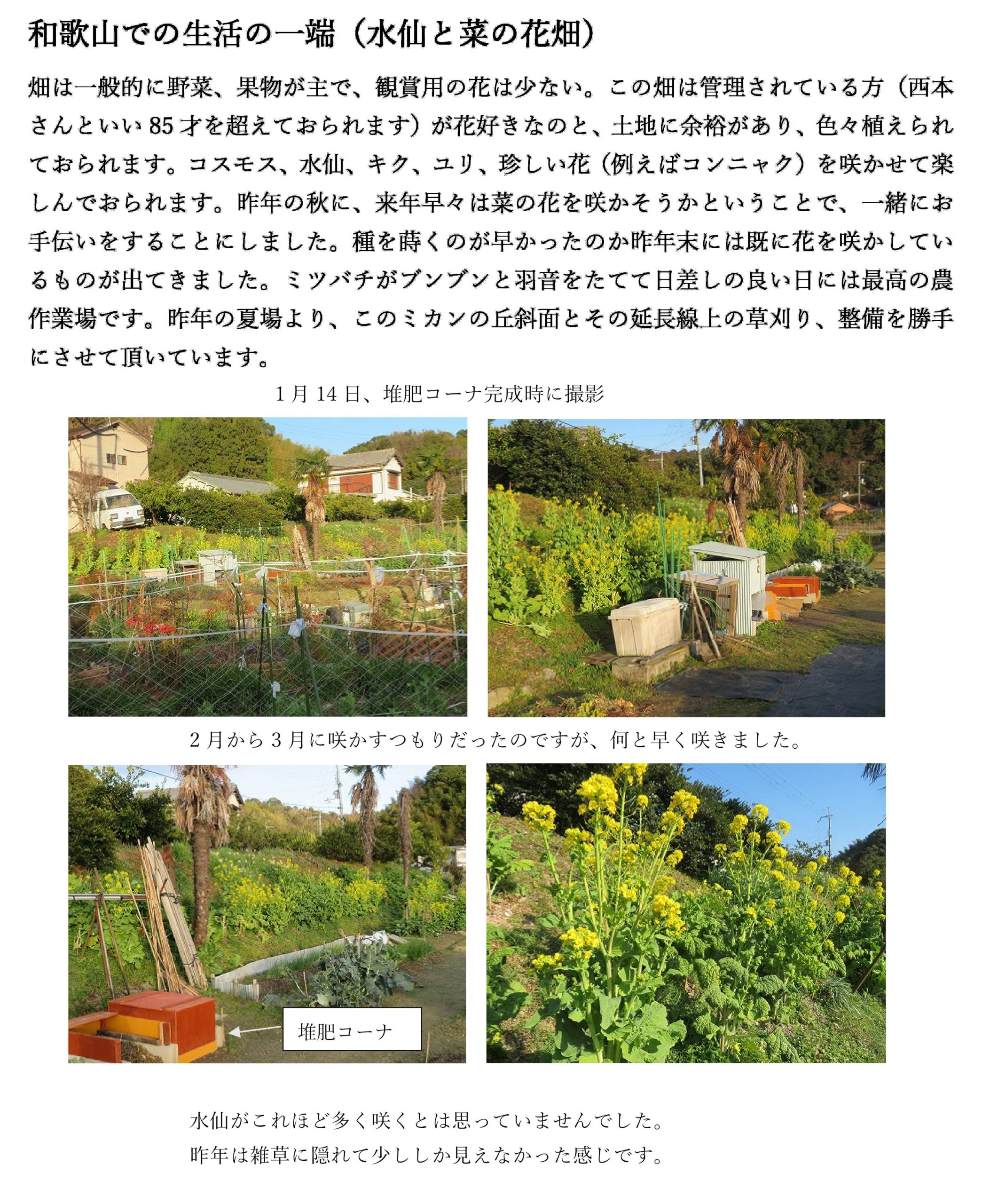 畑は一般的に野菜、果物が主で、観賞用の花は少ない。この畑は管理されている方(西本さんといい85才を超えておられます)が花好きなのと、土地に余裕があり、色々植えられておられます。コスモス、水仙、キク、ユリ、珍しい花(例えばコンニャク)を咲かせて楽しんでおられます。