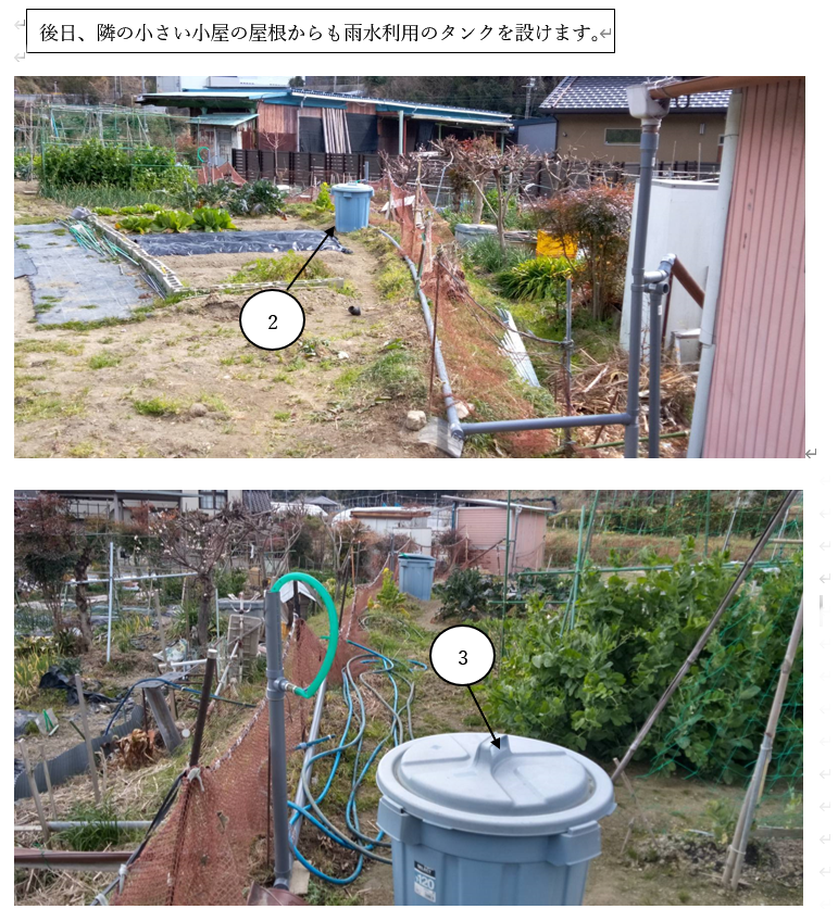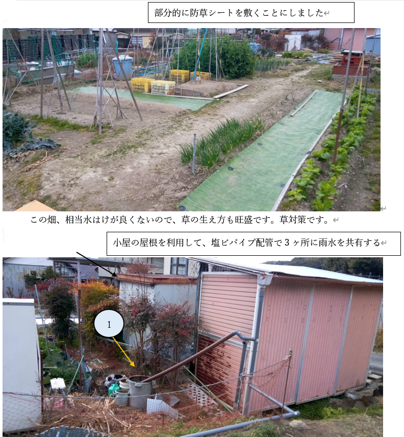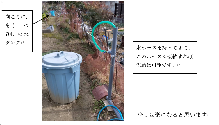 畑作業で最も大事な水の確保です。畑では苗が育つまでは水やりは必修作業となります。育ってからも日照りが続いた場合は必要となります。ポリの容器(ゴミ箱)120ℓ2ヶ、70ℓ1ヶを設置、空になると畑脇の水路(排水溝)よりポンプアップして補充しています。只、ポンプアップ出来るのは雨の日か、雨の直ぐ後に限られます。バッテリーとポンプを水路の傍まで持って行きホースを接続、ポンプの調整等、少し手間がかかります。雨の中の作業となるので面倒です。改良することにしました。畑に物置小屋があるので屋根よりの雨水利用が主になるようにしました。