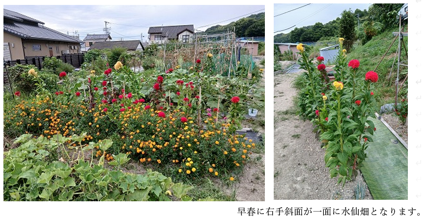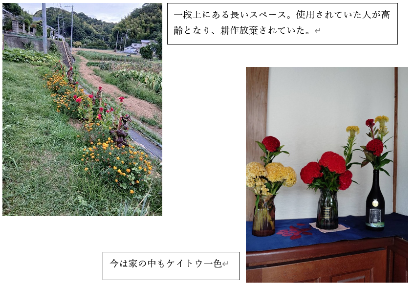 移住生活も早や3年半になり、私の受け持つ畑は短い3畝程から始まり、年々広がって今や、その面積の10倍程になりました。右手のミカン畑の斜面全体も私の管理範囲に勝手にしました。又、1段上の畑もミカン畑の斜面の延長線上にあって、同様に勝手に管理範囲になってしまいました。作る作物は出来るだけ手の掛からない、面積的にも広さを必要とする物を選んでいます。花は有効です。春は菜の花畑、夏はケイトウとマリーゴールドのパターンです。秋は菊と自然生えのコスモスが盛況です。この夏は雨に恵まれず、その上、気温が高かったのですが、ケイトウ、マリーゴールドはほとんど水やりをしないで、育ちました。マリーゴールドを足元に多めに敷き詰めました。これが、虫対策となったようで、全くと言って良いほど虫、病気は発生しませんでした。一方で野菜類は虫(ウリハムシ、カメムシの類)に悩まされました。